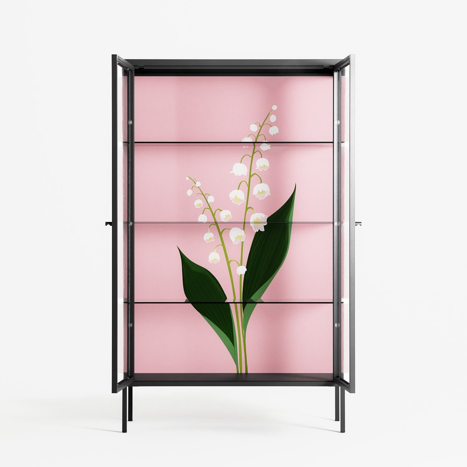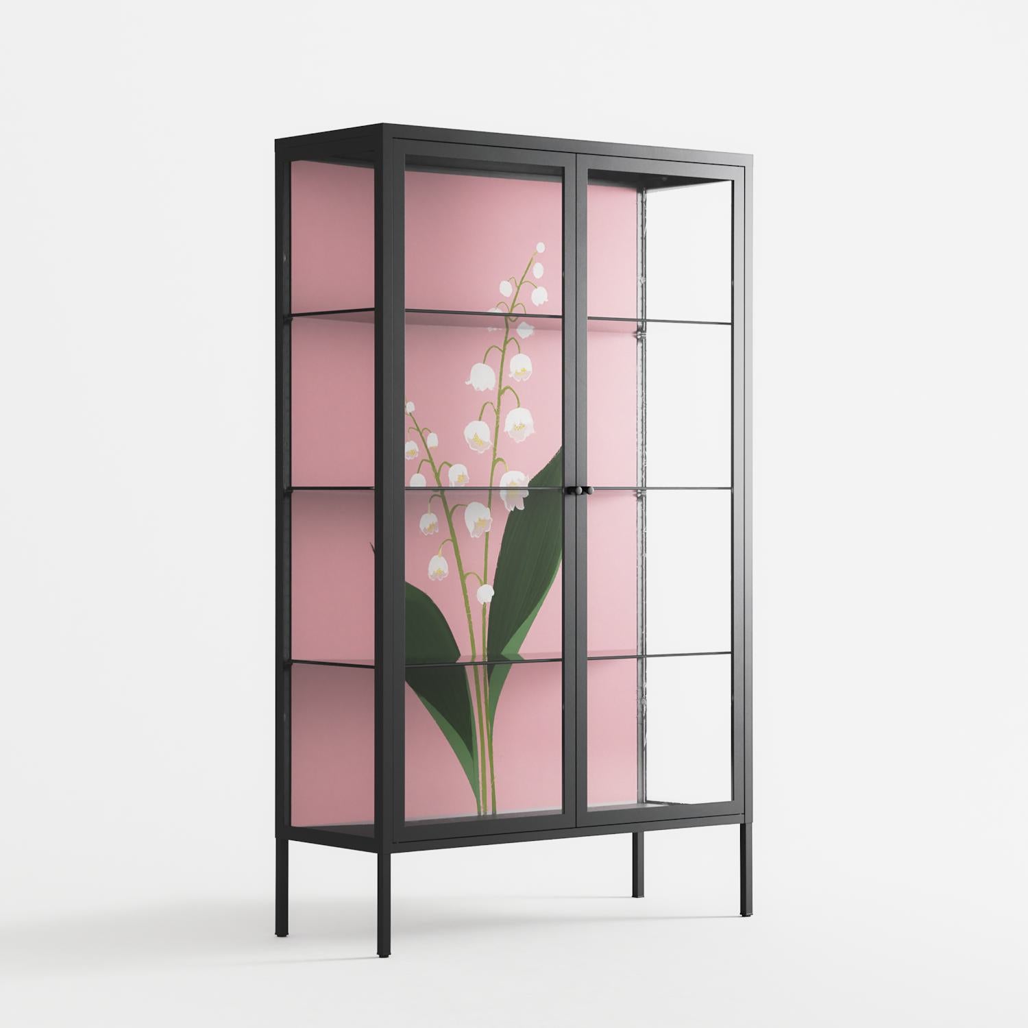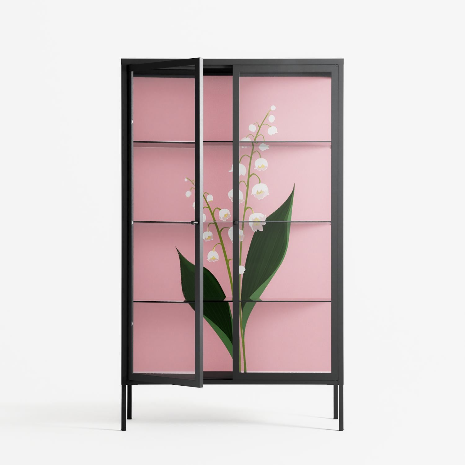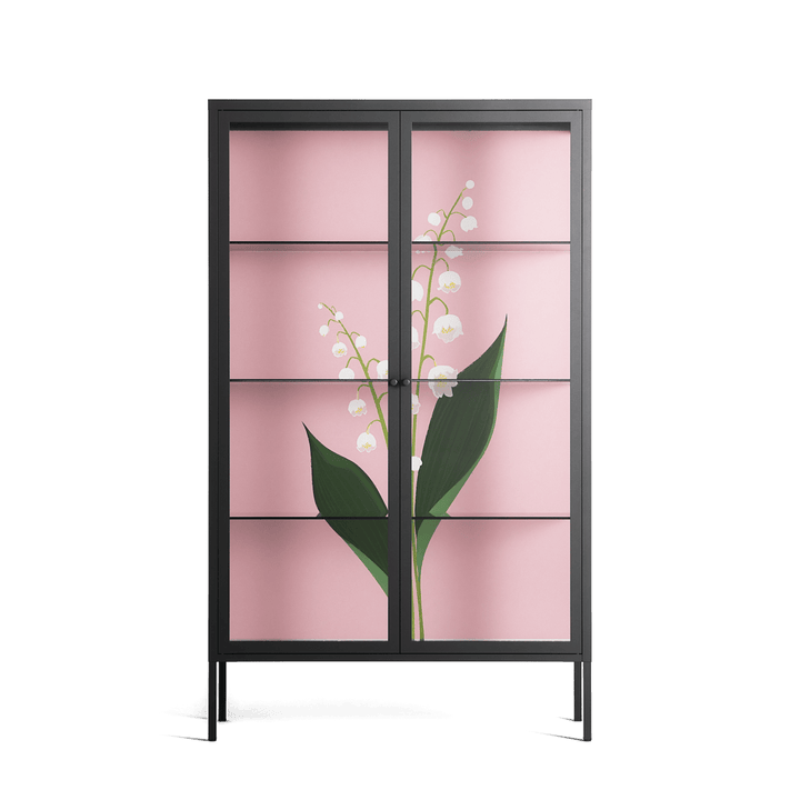 Kalas Konvalj by Nur Rydberg, displayed within the Vitrine Cabinet behind Clear glass. Finished in the colour Antracite, the cabinet becomes a frame for the artwork and the objects within.