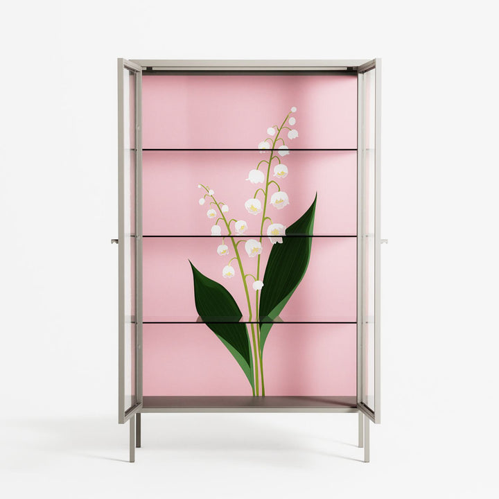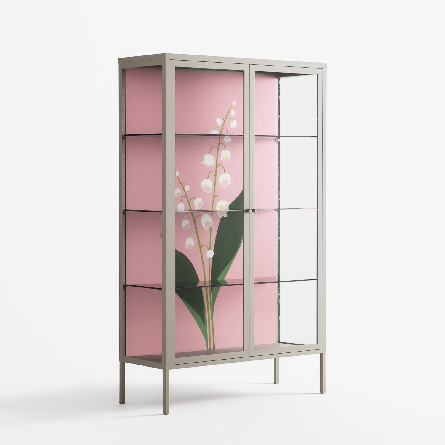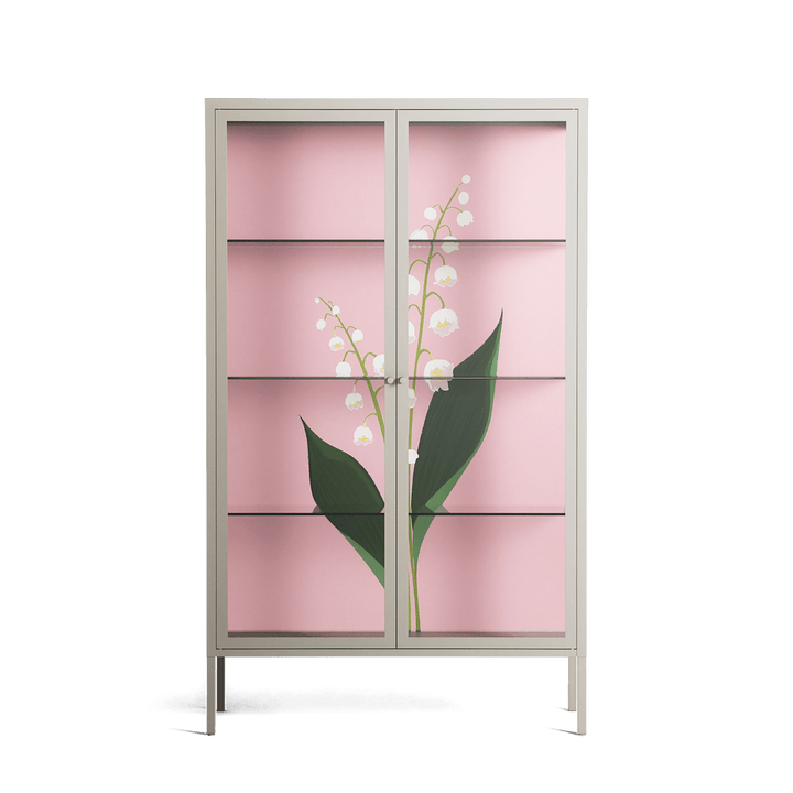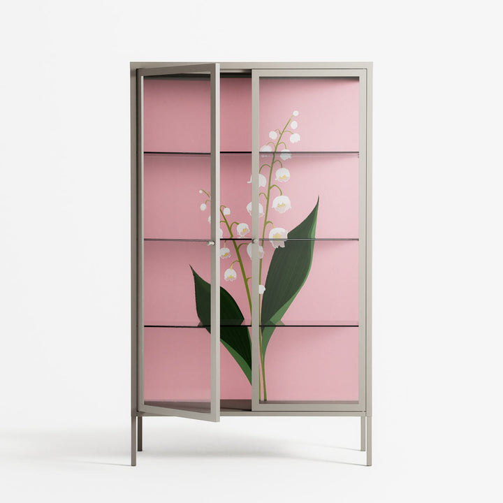 Kalas Konvalj by Nur Rydberg, displayed within the Vitrine Cabinet behind Clear glass. Finished in the colour Pebble, the cabinet becomes a frame for the artwork and the objects within.