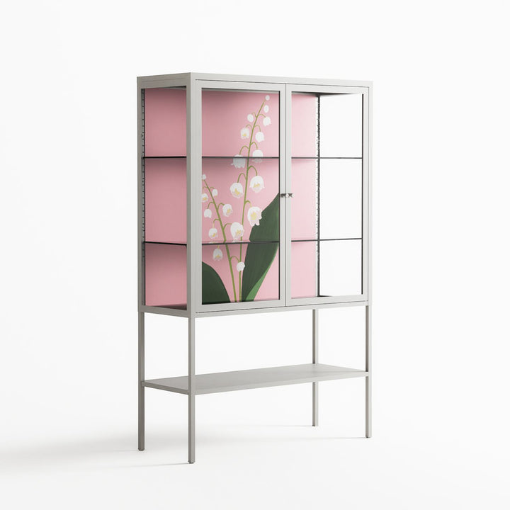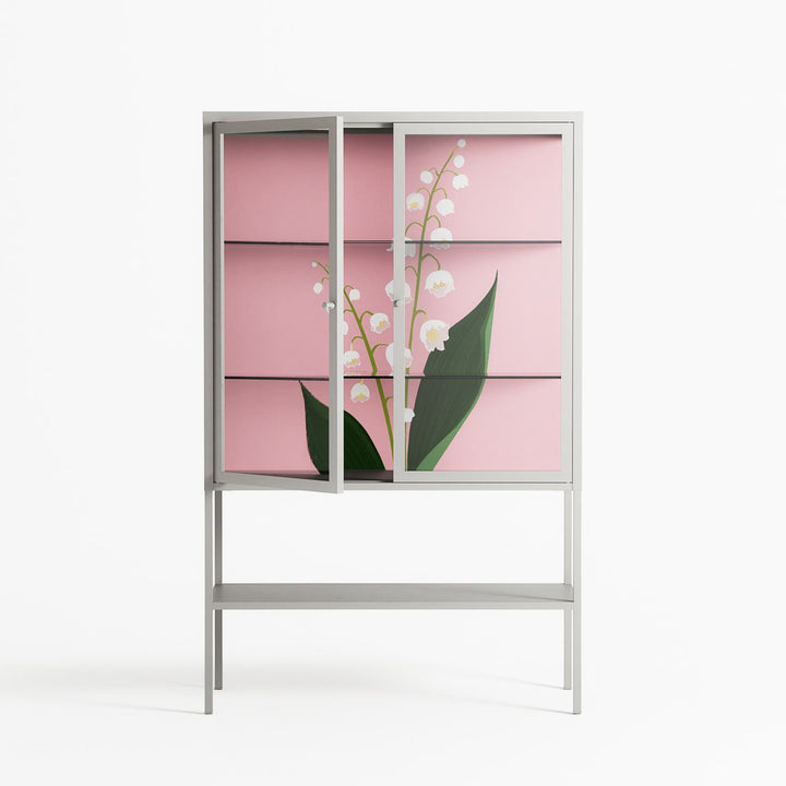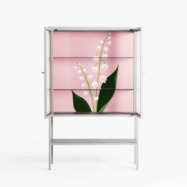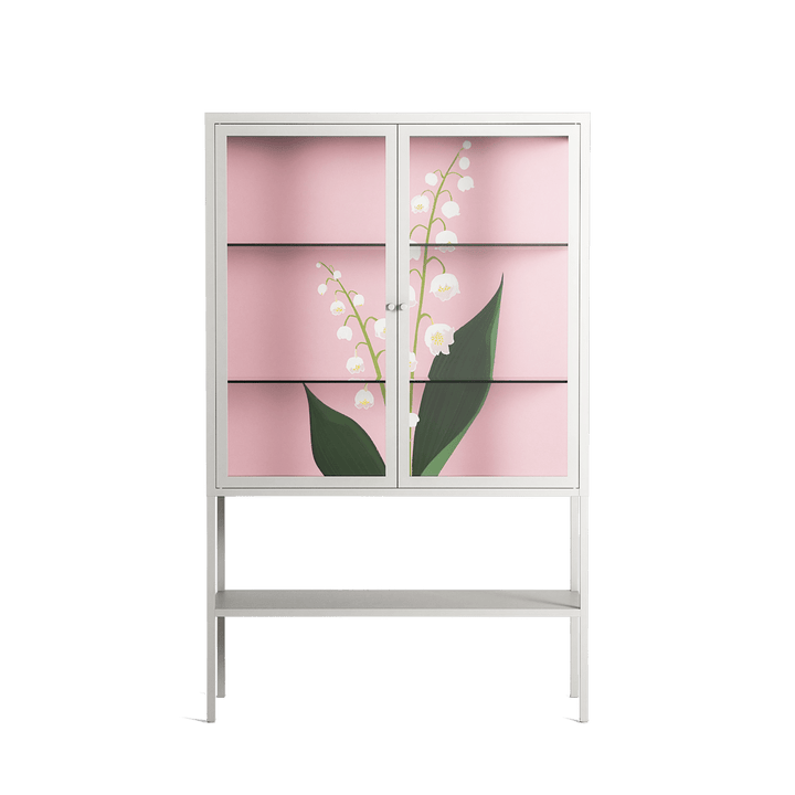 Kalas Konvalj by Nur Rydberg, displayed within the Vitrine Loft Cabinet behind Clear glass. Finished in the colour Chalk, the cabinet becomes a frame for the artwork and the objects within.