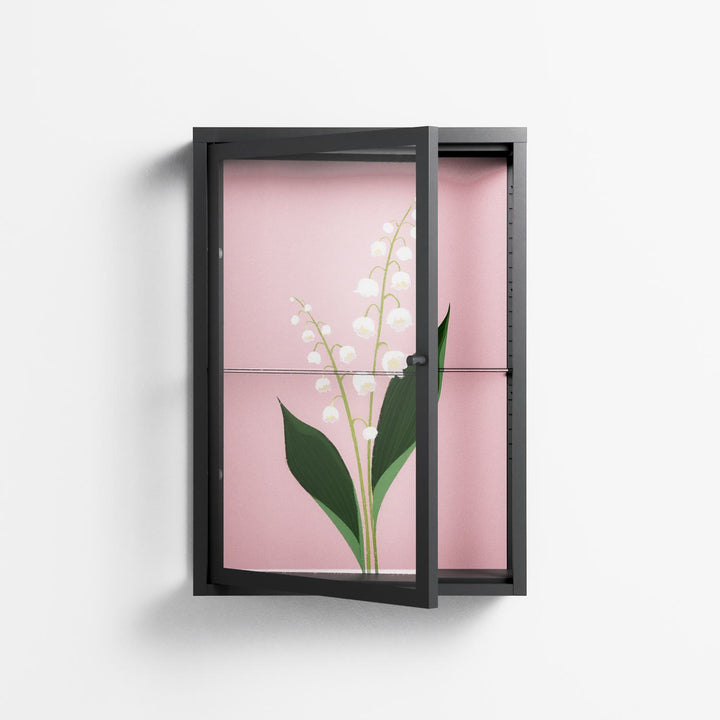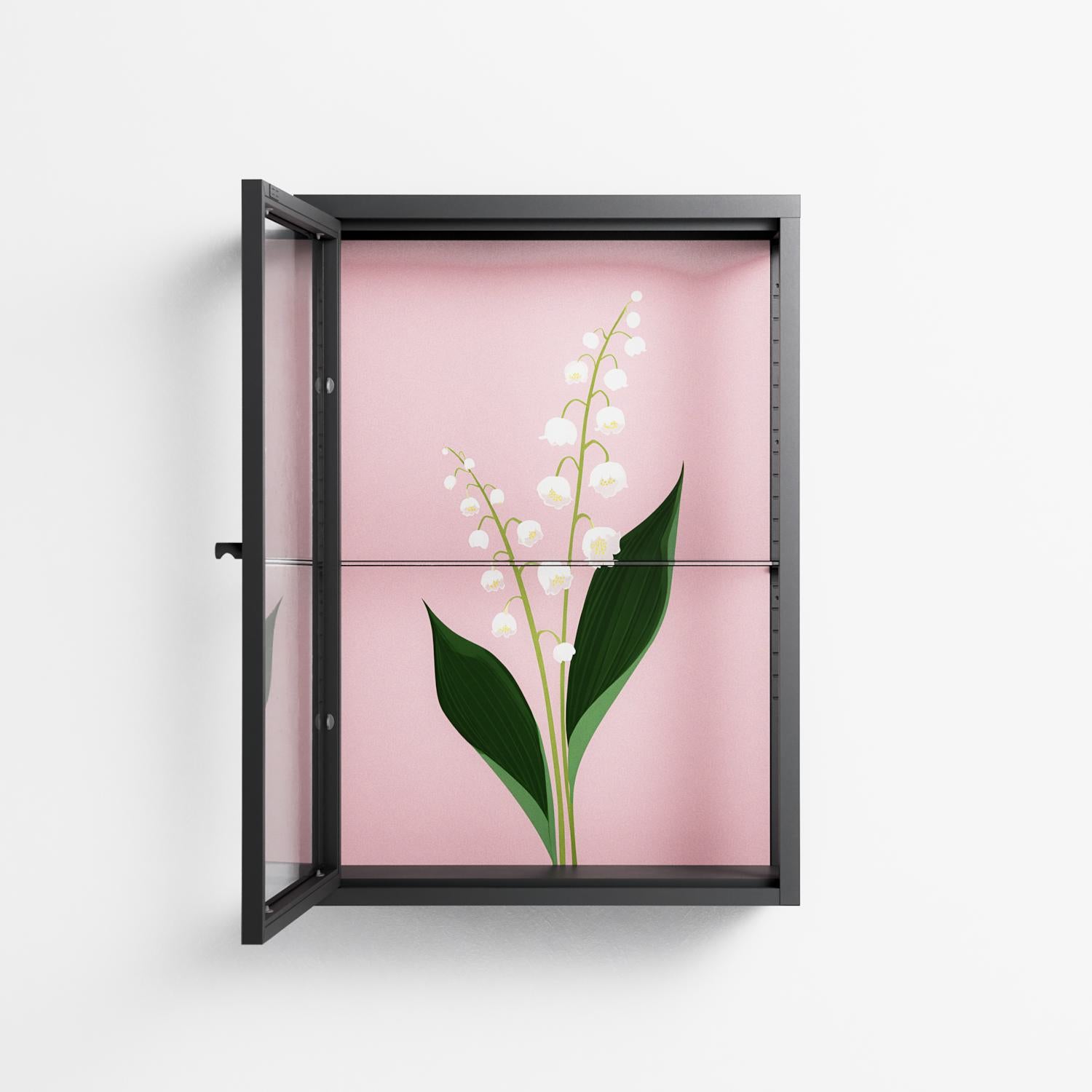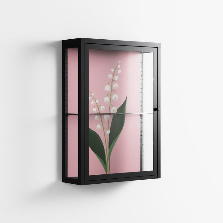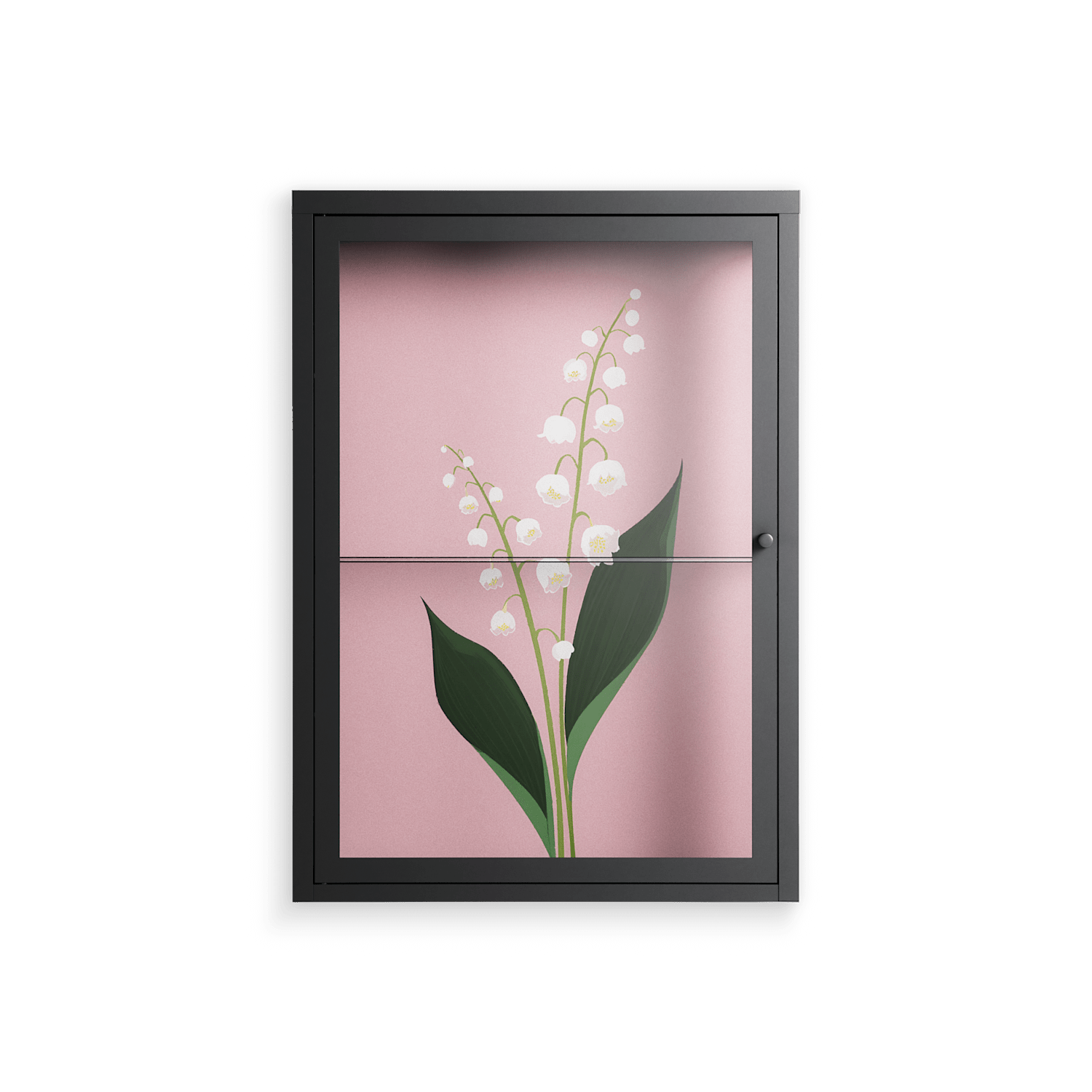 Kalas Konvalj by Nur Rydberg, displayed within the Vitrine Wall Cabinet behind Clear glass. Finished in the colour Antracite, the cabinet becomes a frame for the artwork and the objects within.