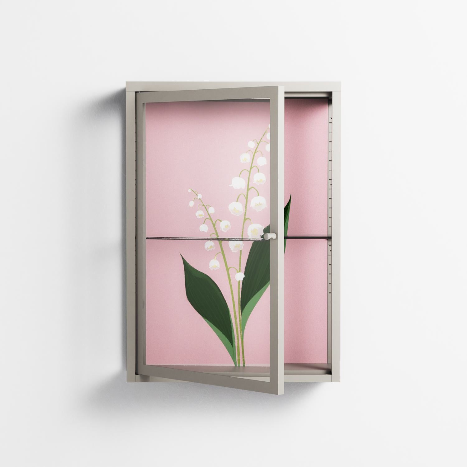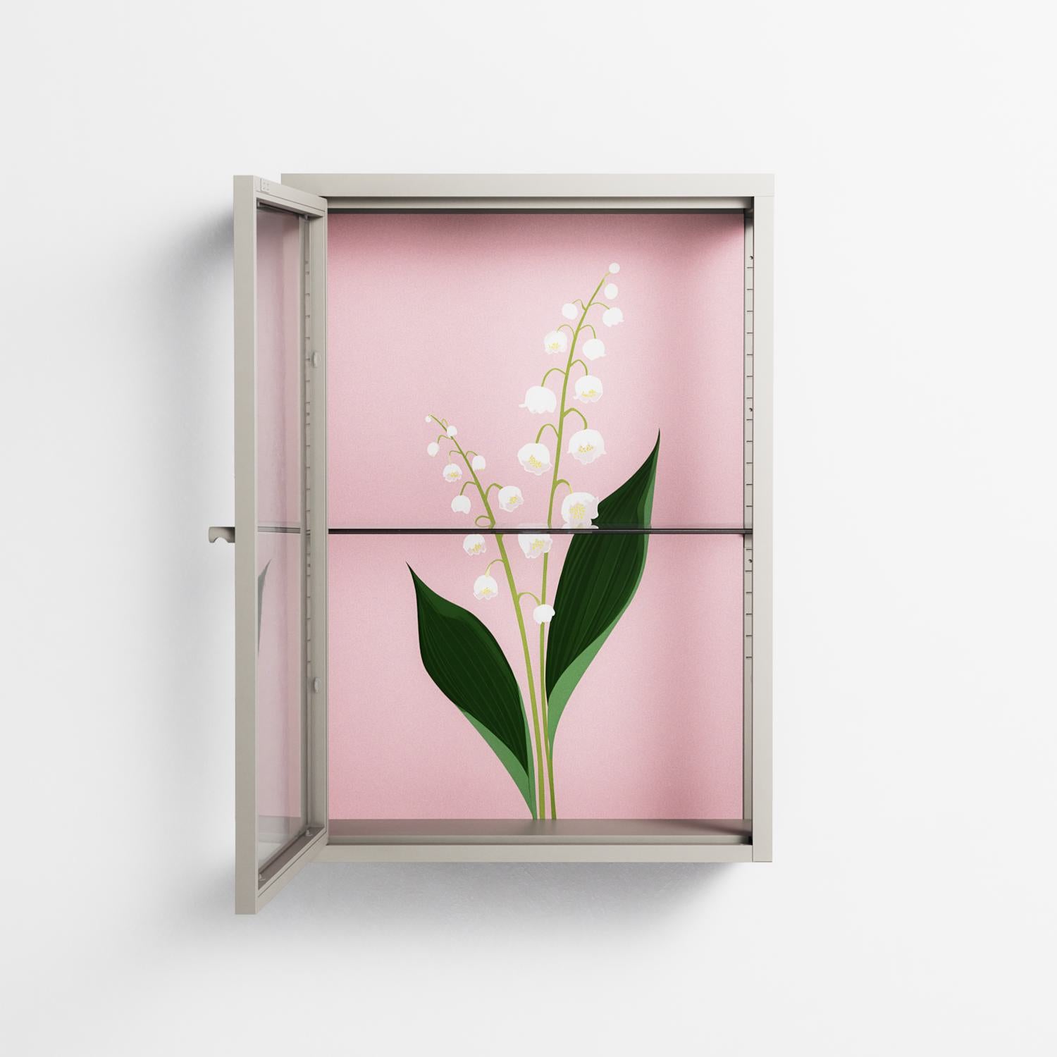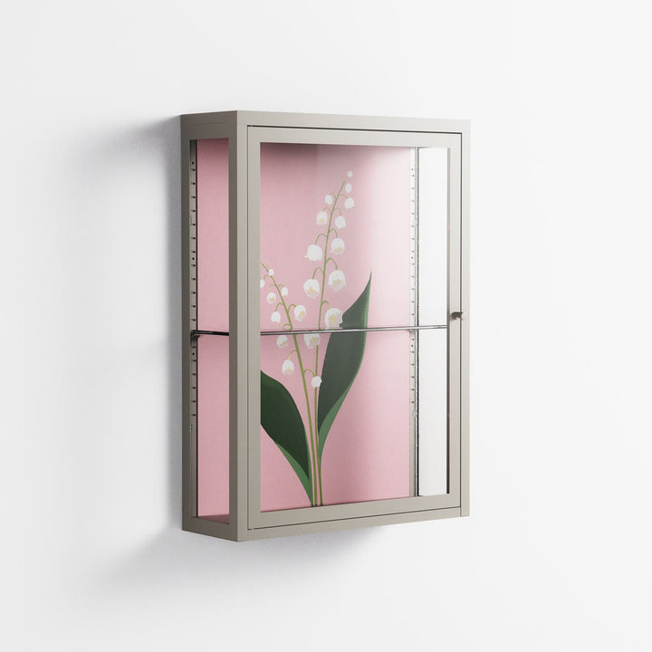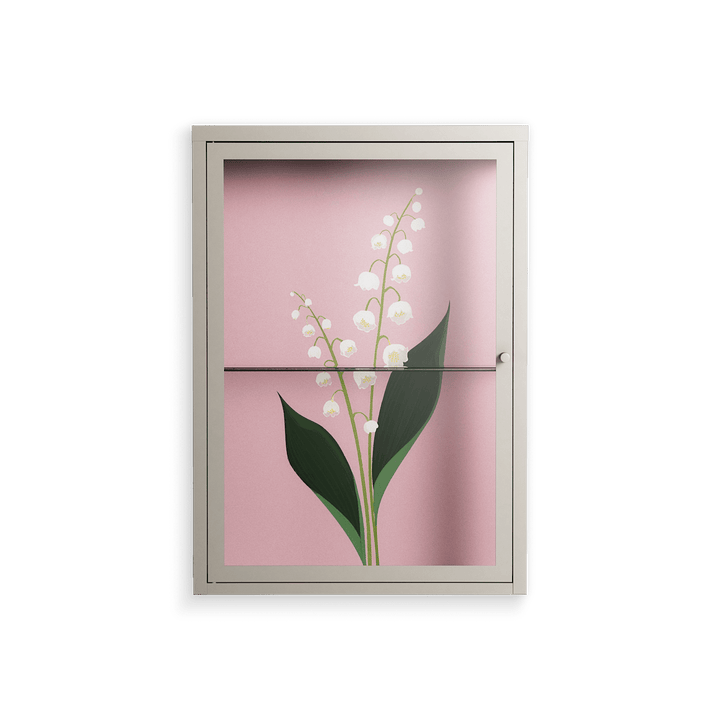 Kalas Konvalj by Nur Rydberg, displayed within the Vitrine Wall Cabinet behind Clear glass. Finished in the colour Pebble, the cabinet becomes a frame for the artwork and the objects within.