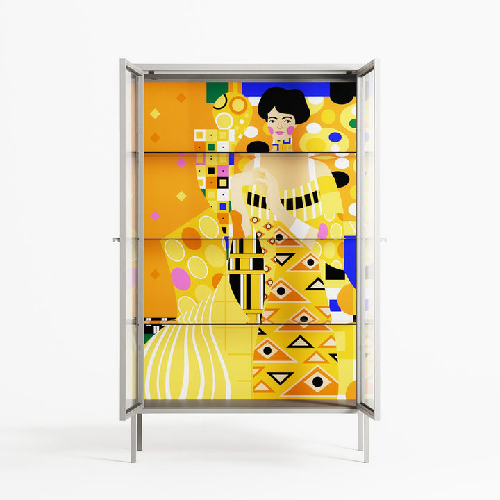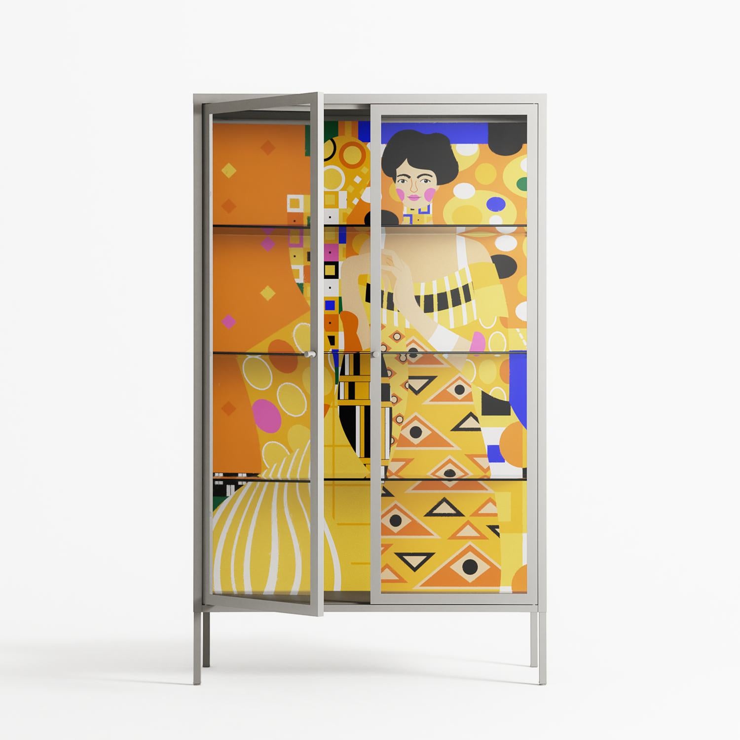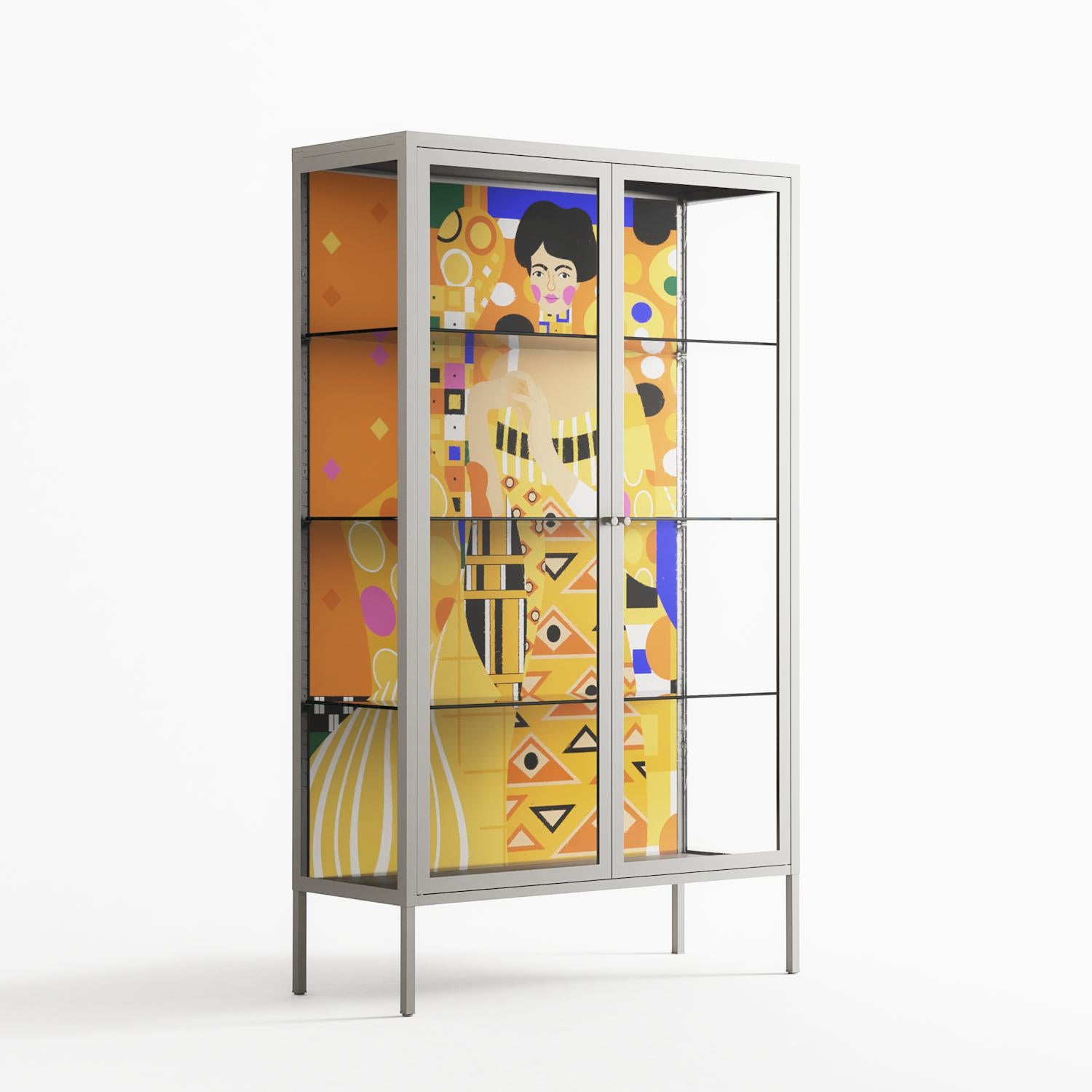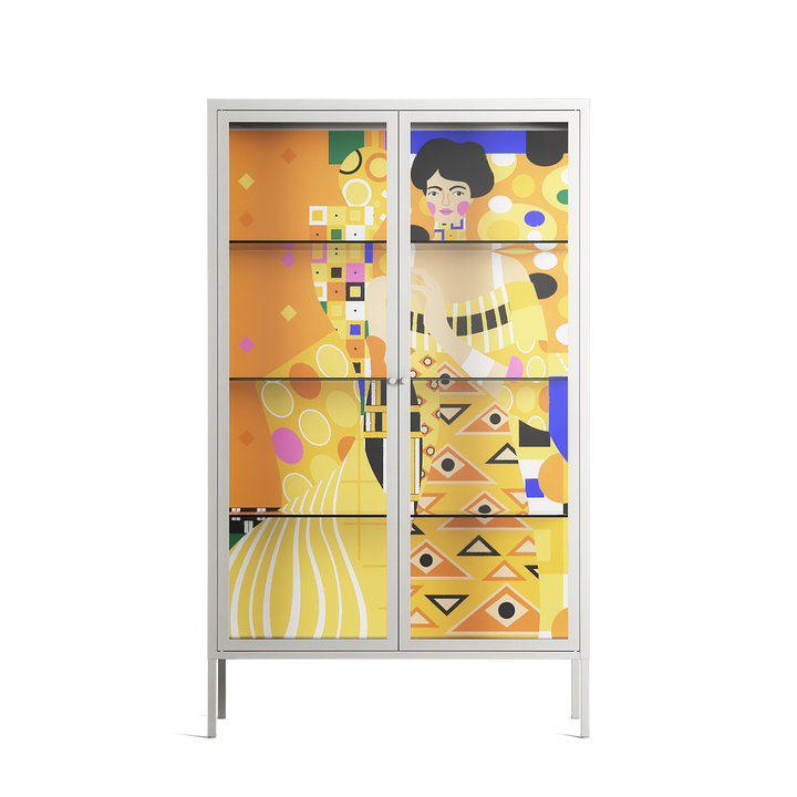 Klimt by Heather Zhou, displayed within the Vitrine Cabinet behind Clear glass. Finished in the colour Chalk, the cabinet becomes a frame for the artwork and the objects within.