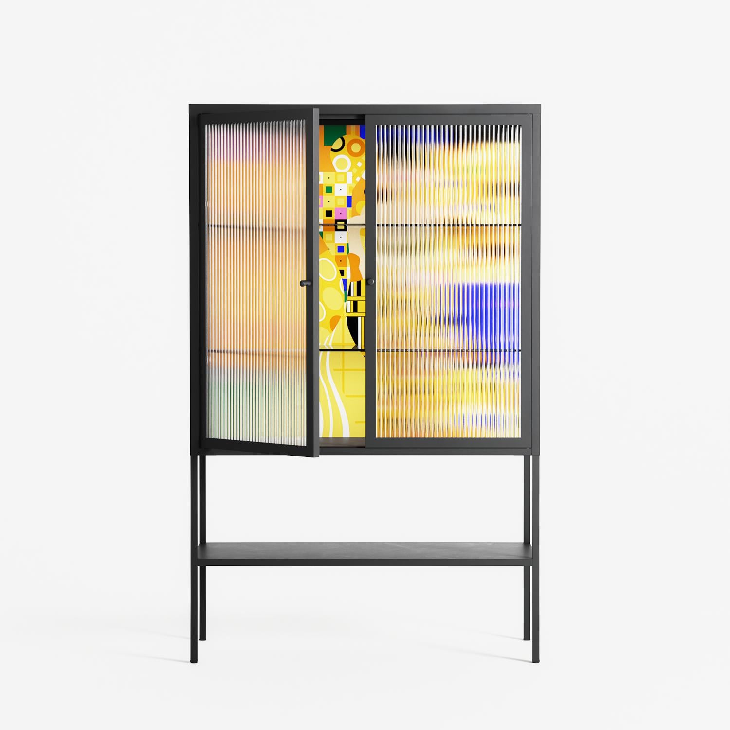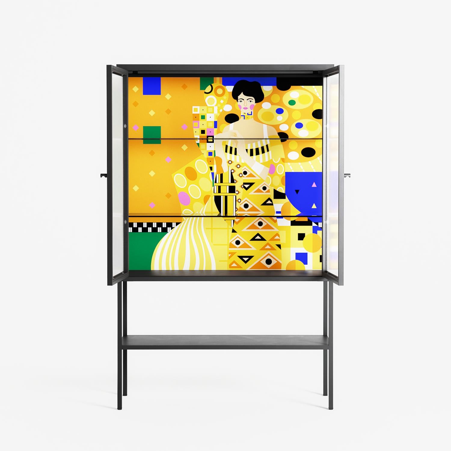 Klimt by Heather Zhou, displayed within the Vitrine Loft Cabinet behind Reeded glass. Finished in the colour Antracite, the cabinet becomes a frame for the artwork and the objects within.