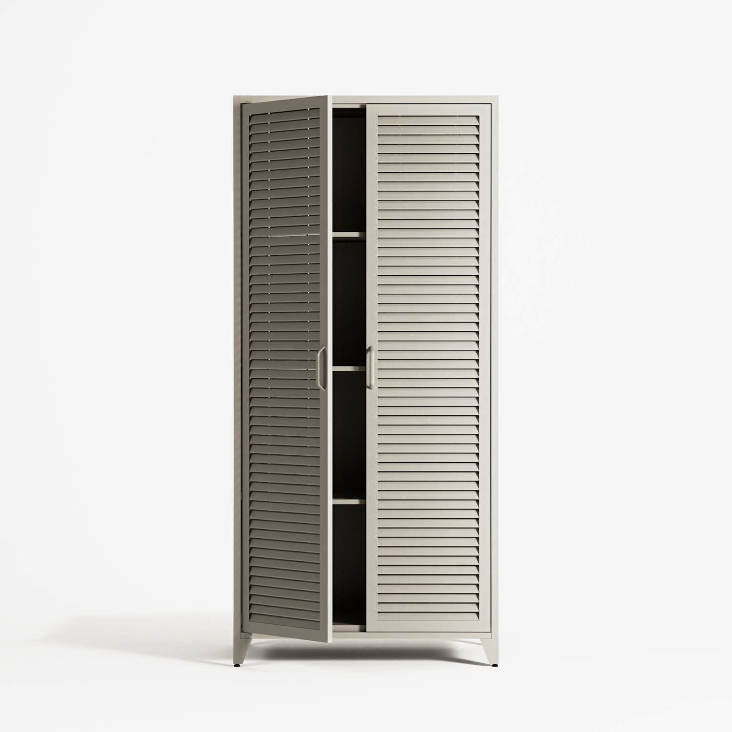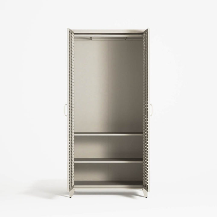 Mandarin, double door wardrobe, finished in the colour Pebble. A classic silhouette with shuttered doors — reimagined by Workdeco through precise, contemporary manufacturing.