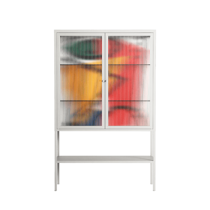 Misplaced by Vratislav Pecka, displayed within the Vitrine Loft Cabinet behind Reeded glass. Finished in the colour Chalk, the cabinet becomes a frame for the artwork and the objects within.