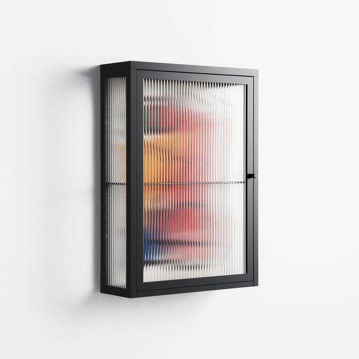 Misplaced by Vratislav Pecka, displayed within the Vitrine Wall Cabinet behind Reeded glass. Finished in the colour Antracite, the cabinet becomes a frame for the artwork and the objects within.