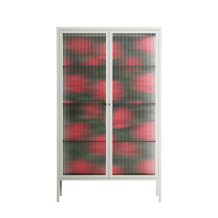 Mormors Rabatt by Nur Rydberg, displayed within the Vitrine Cabinet behind Reeded glass. Finished in the colour Chalk, the cabinet becomes a frame for the artwork and the objects within.