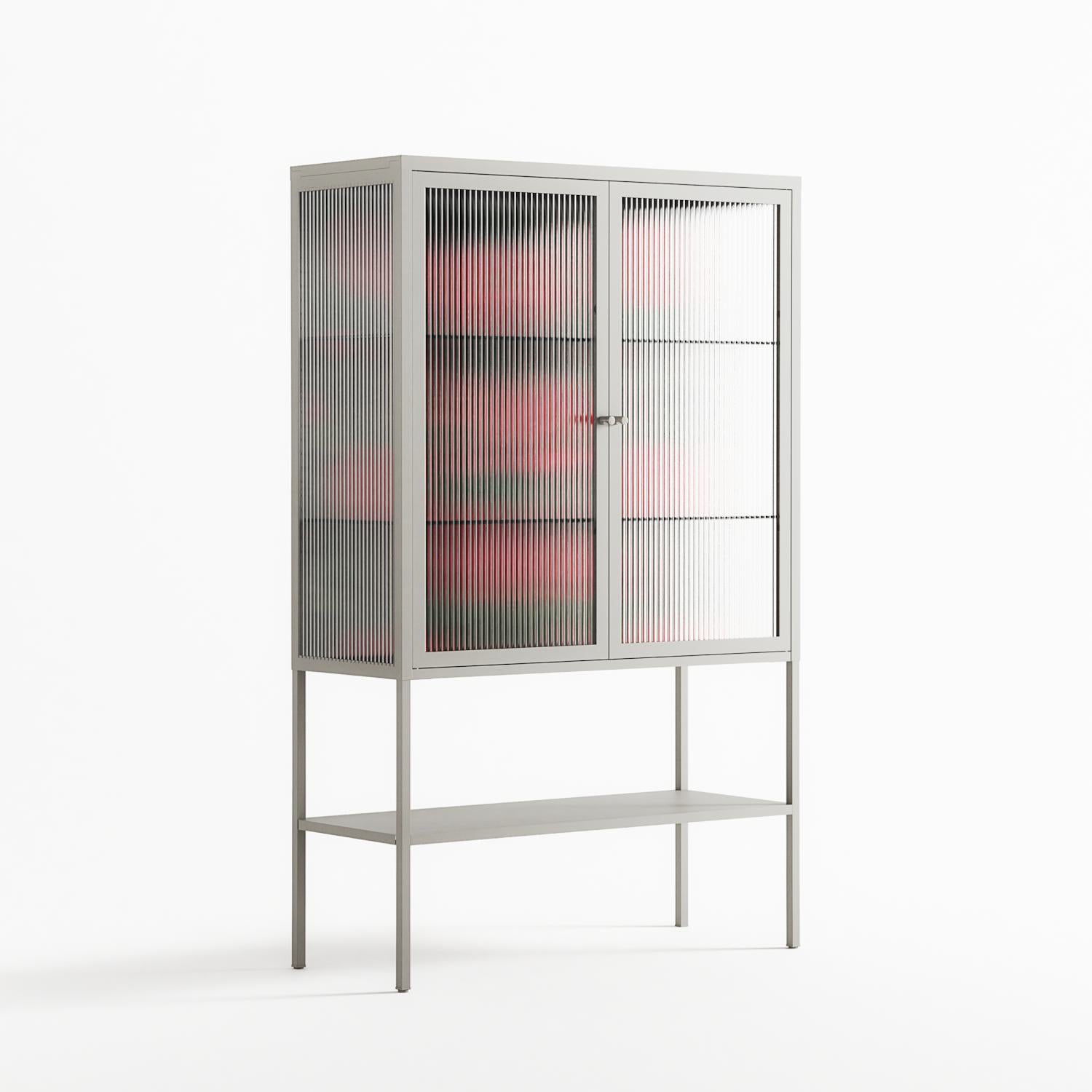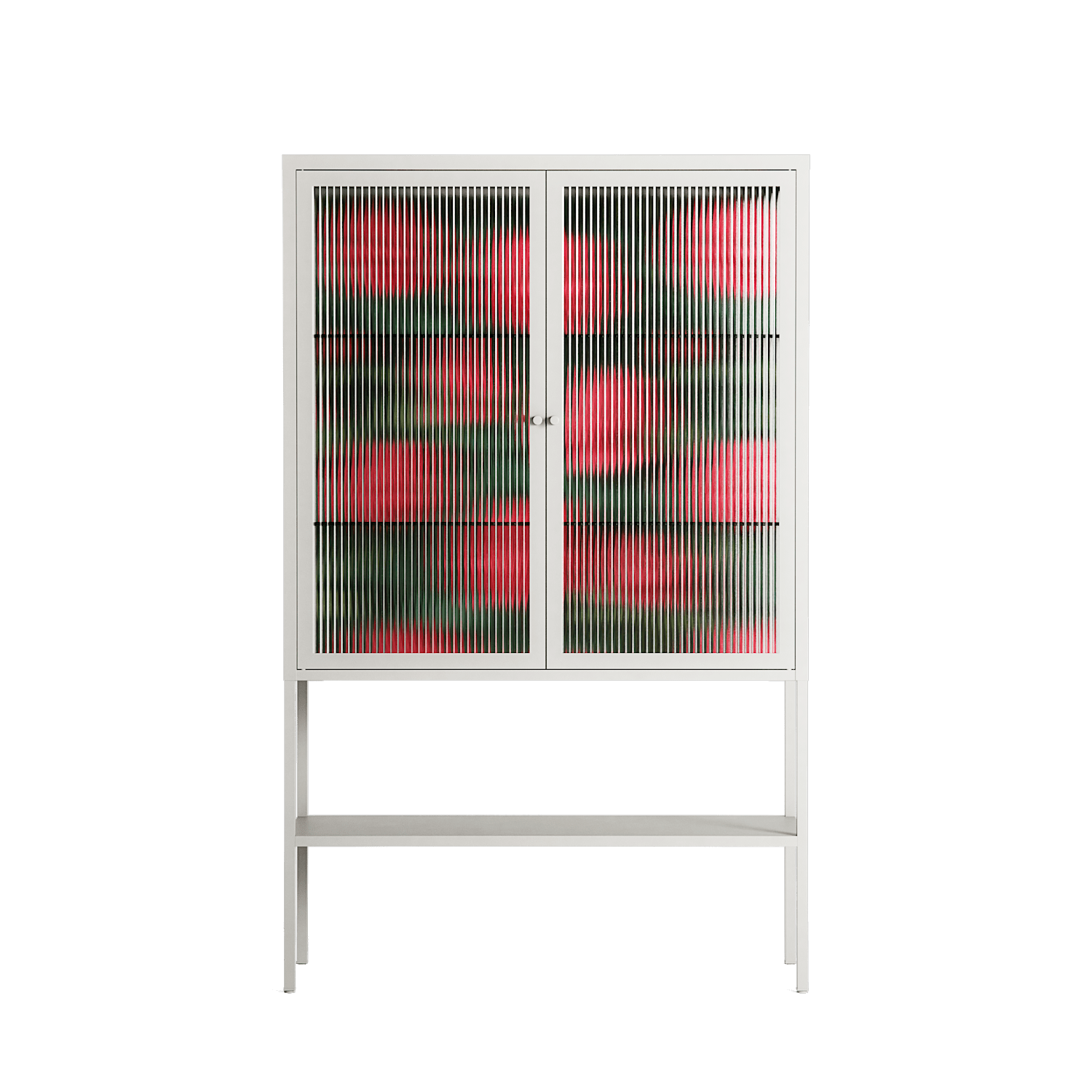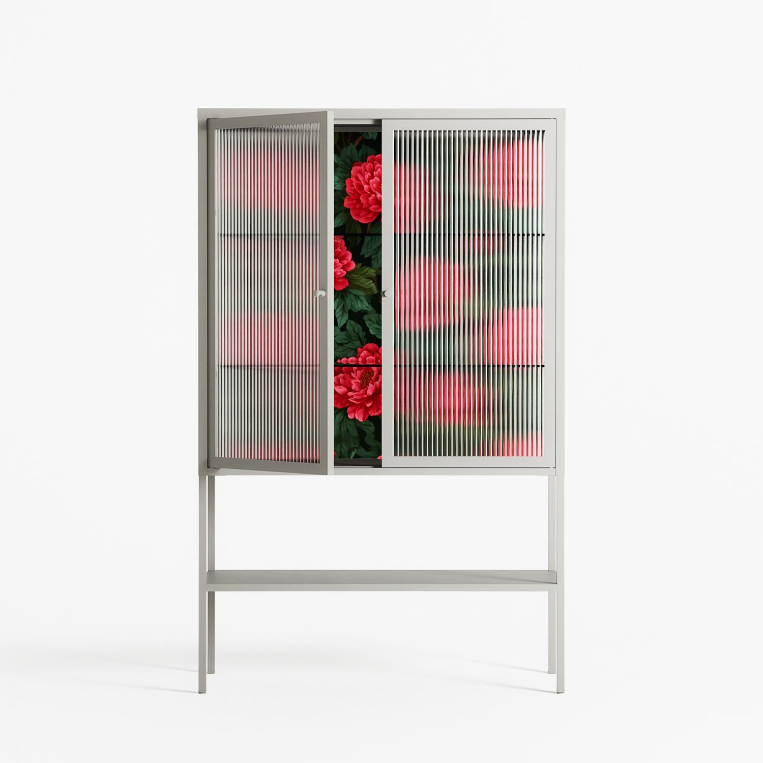 Mormors Rabatt by Nur Rydberg, displayed within the Vitrine Loft Cabinet behind Reeded glass. Finished in the colour Chalk, the cabinet becomes a frame for the artwork and the objects within.
