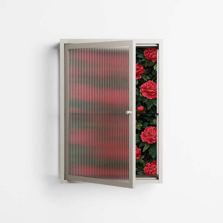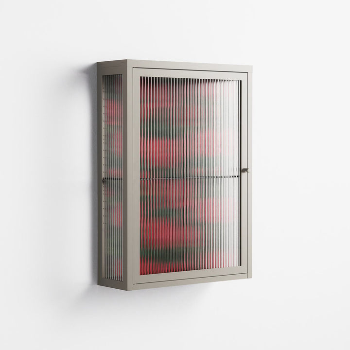 Mormors Rabatt by Nur Rydberg, displayed within the Vitrine Wall Cabinet behind Reeded glass. Finished in the colour Pebble, the cabinet becomes a frame for the artwork and the objects within.