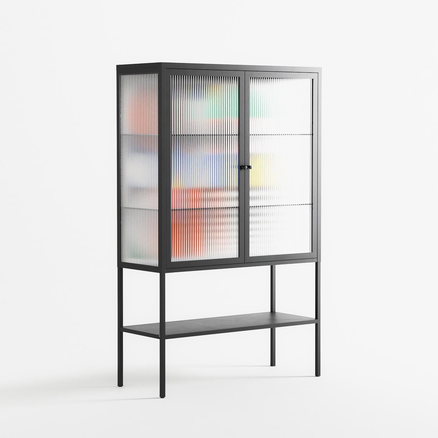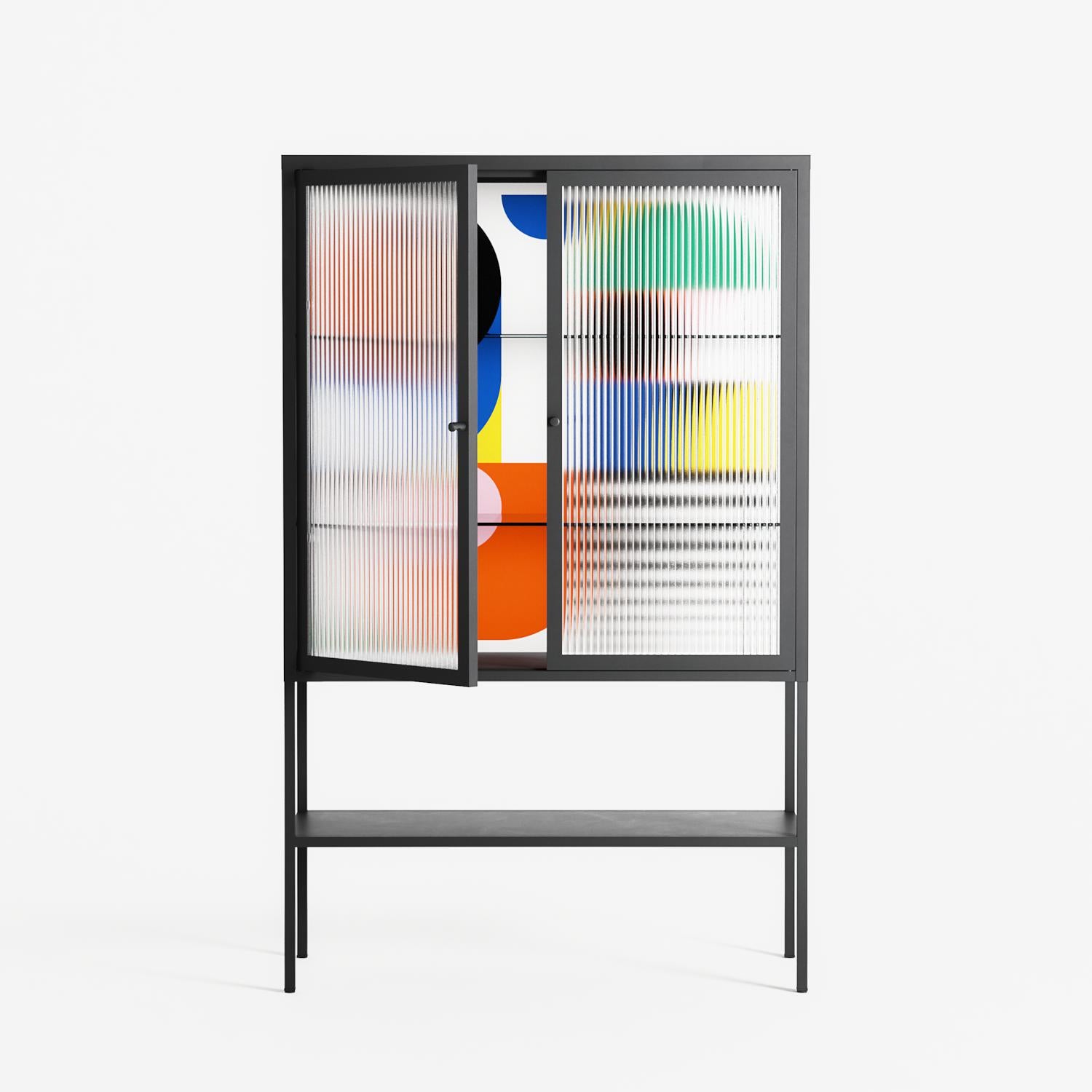 Murano by Vratislav Pecka, displayed within the Vitrine Loft Cabinet behind Reeded glass. Finished in the colour Antracite, the cabinet becomes a frame for the artwork and the objects within.