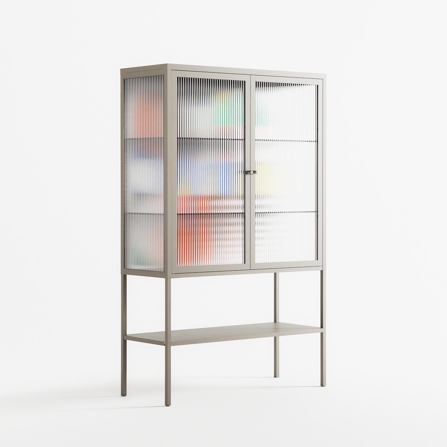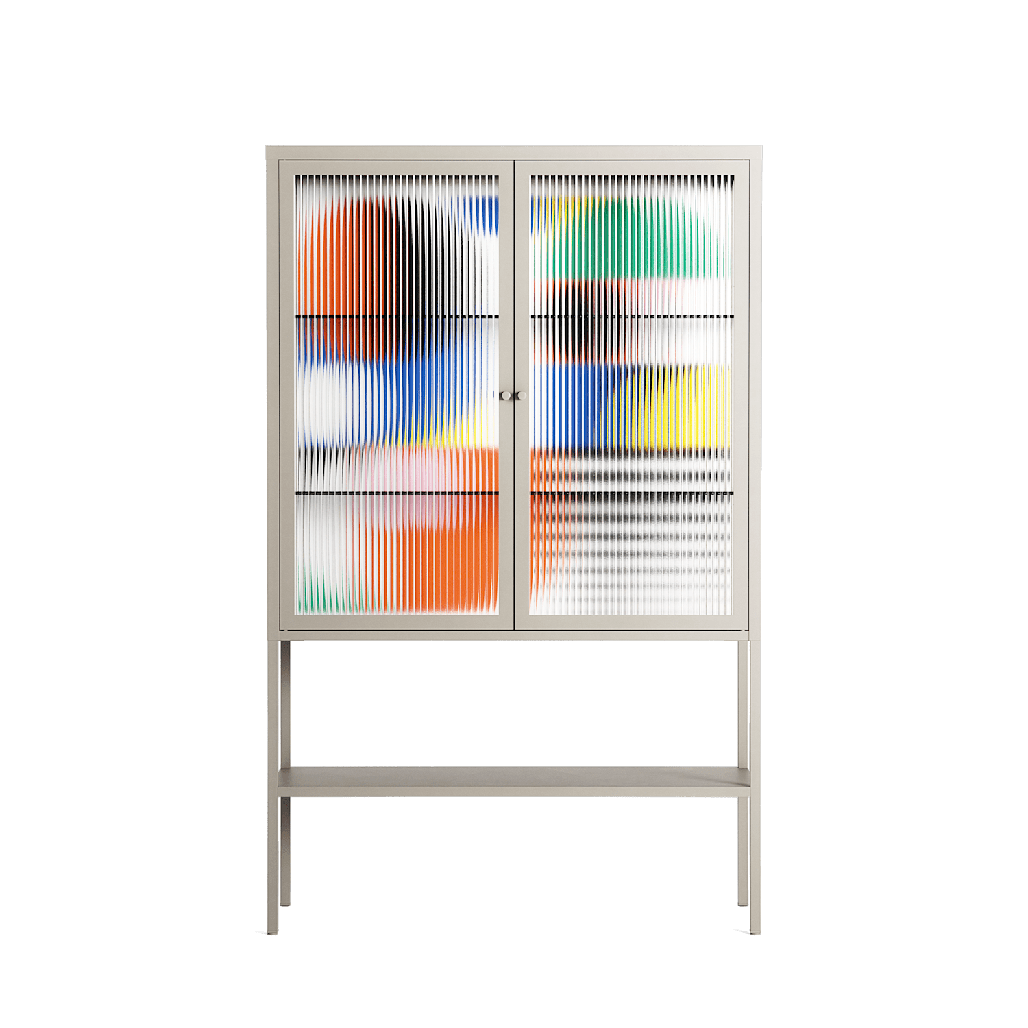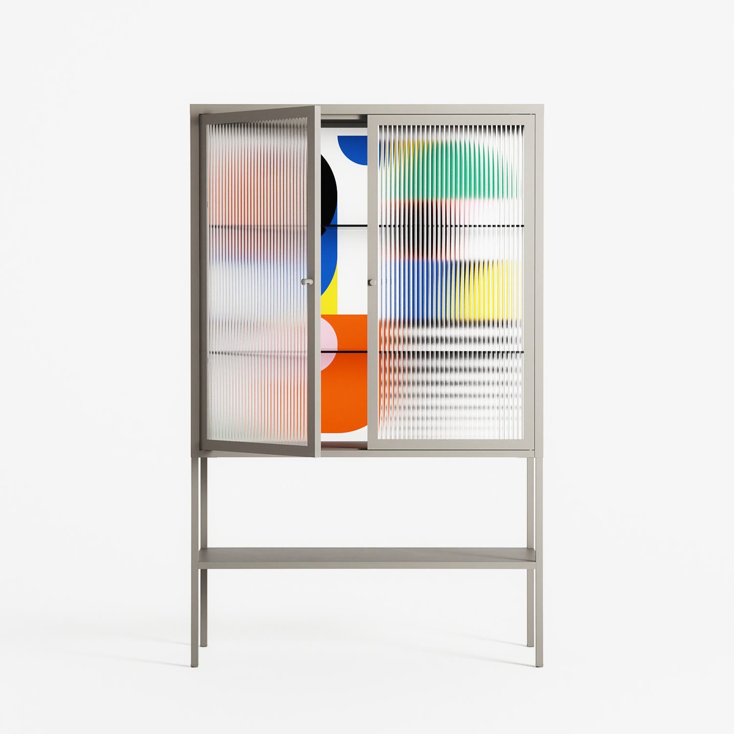 Murano by Vratislav Pecka, displayed within the Vitrine Loft Cabinet behind Reeded glass. Finished in the colour Pebble, the cabinet becomes a frame for the artwork and the objects within.