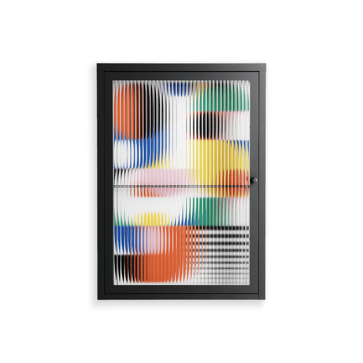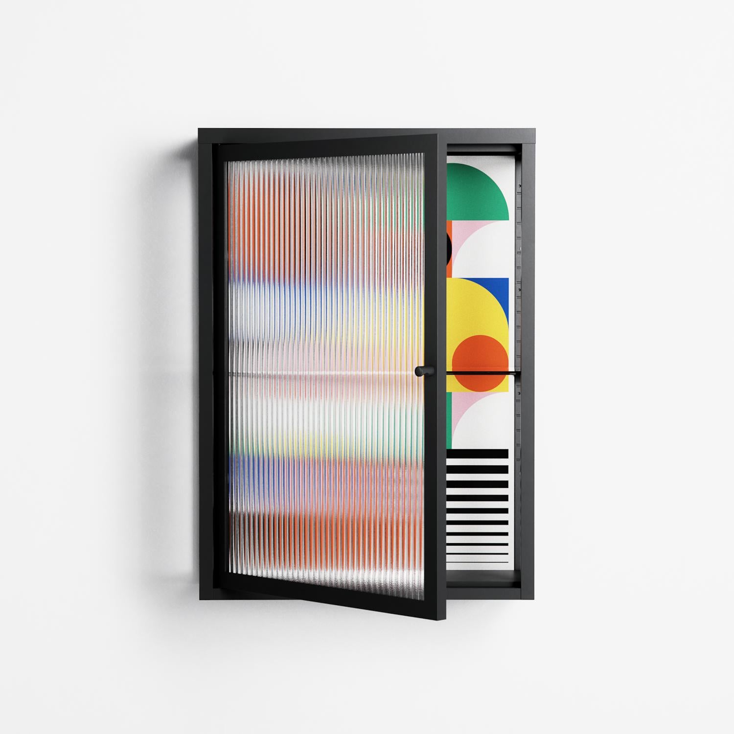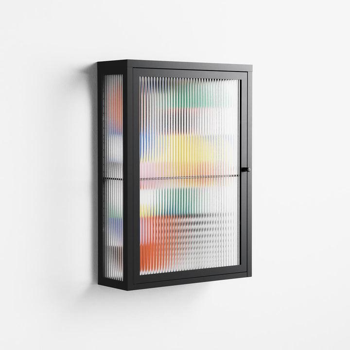 Murano by Vratislav Pecka, displayed within the Vitrine Wall Cabinet behind Reeded glass. Finished in the colour Antracite, the cabinet becomes a frame for the artwork and the objects within.