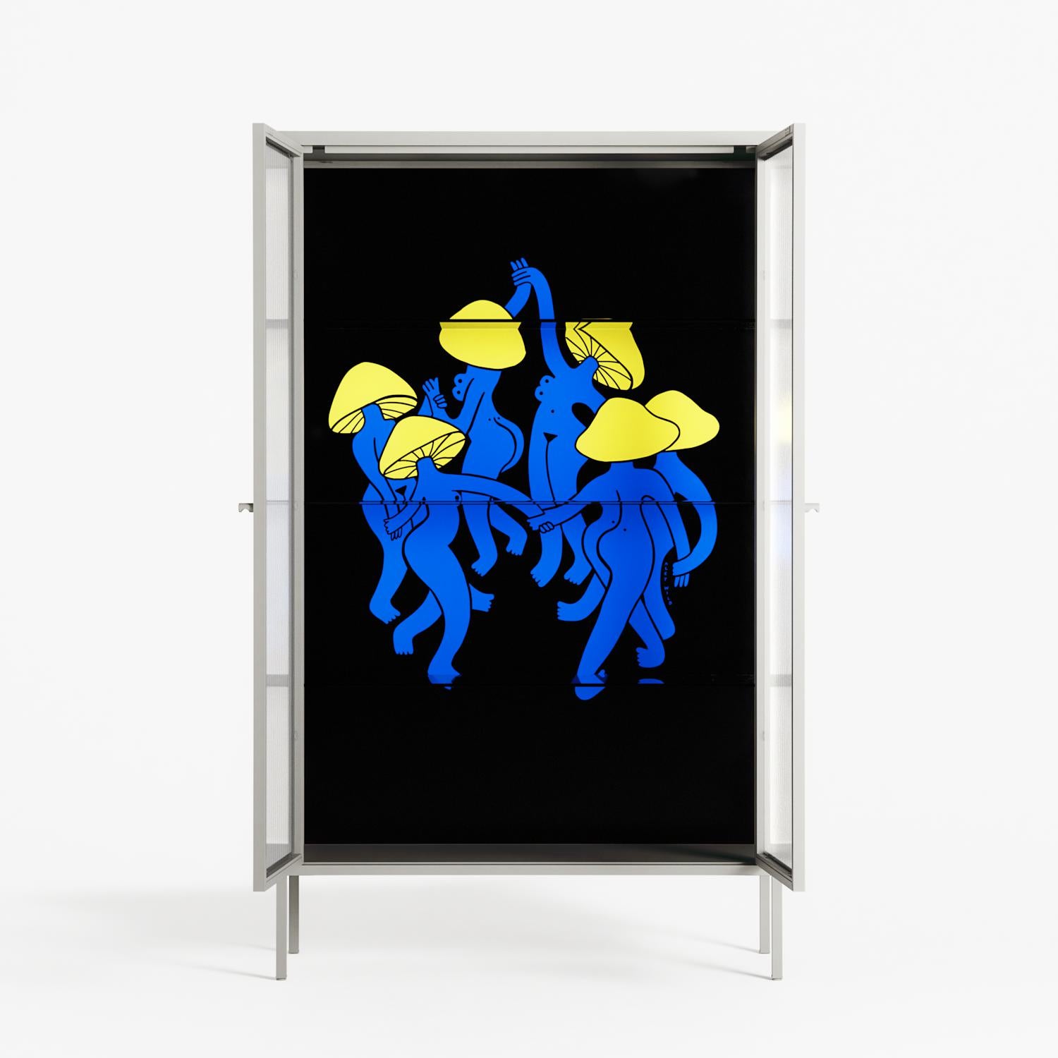 Mushroom Dance Blue by Aley Wild, displayed within the Vitrine Cabinet behind Reeded glass. Finished in the colour Chalk, the cabinet becomes a frame for the artwork and the objects within.