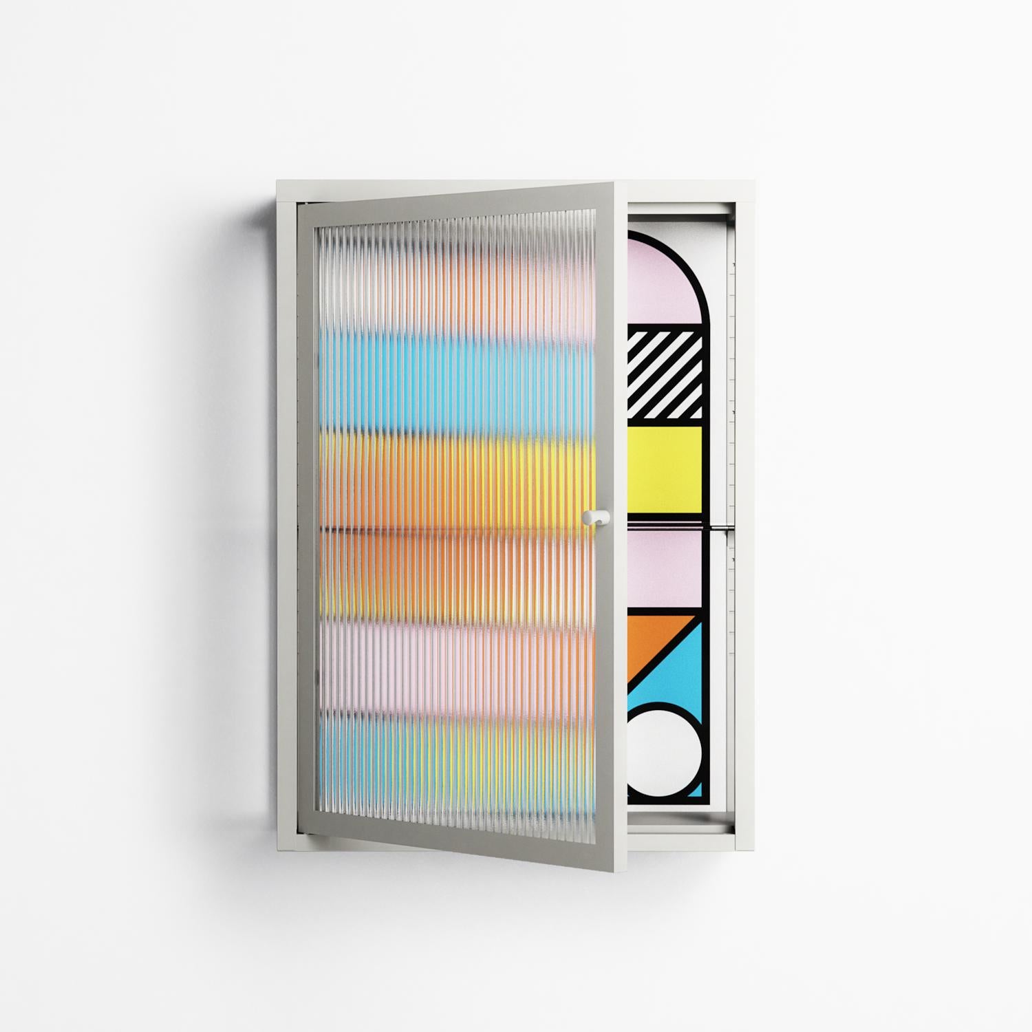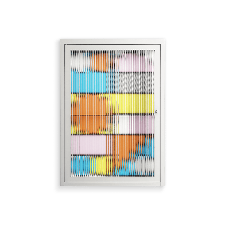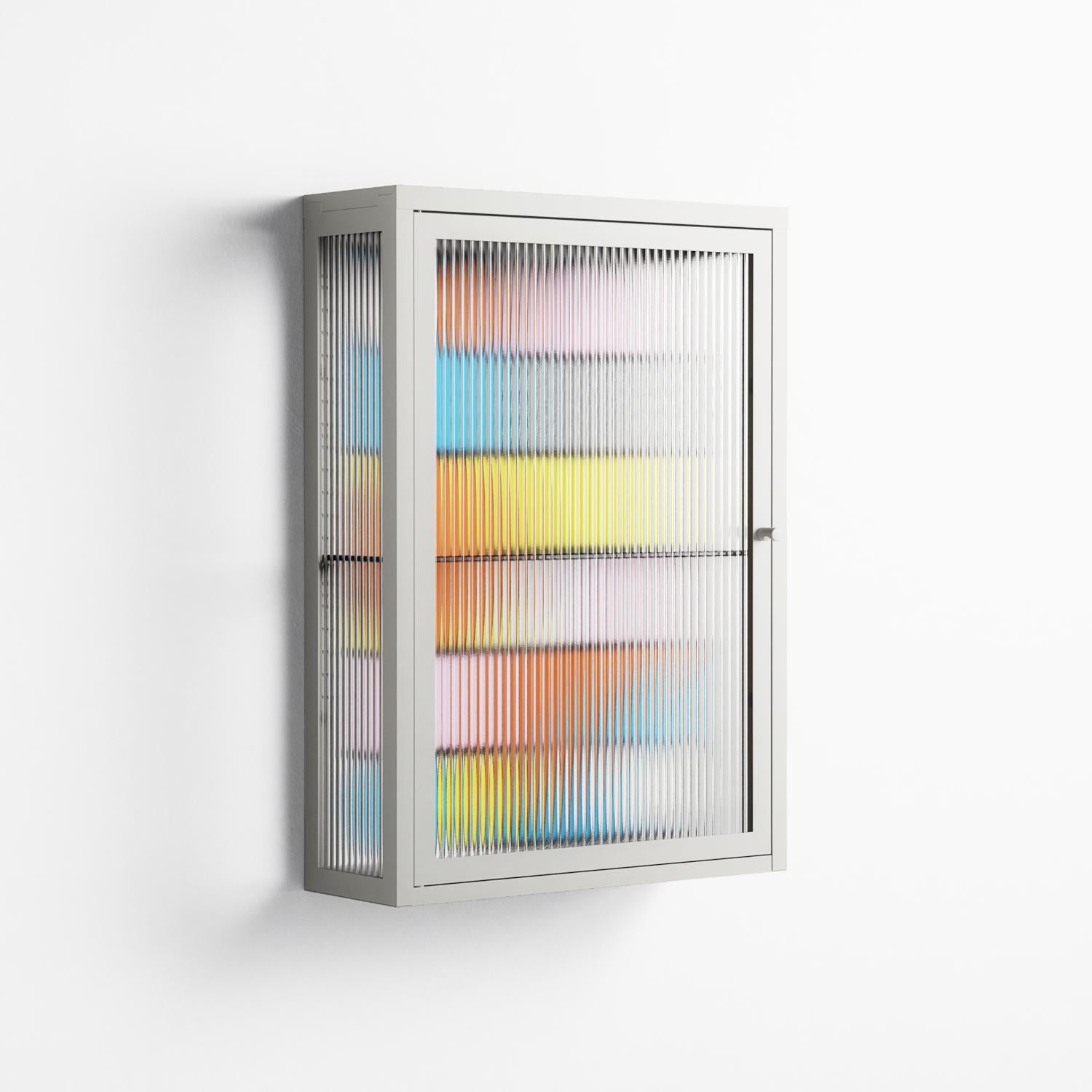 Palette by Vratislav Pecka, displayed within the Vitrine Wall Cabinet behind Reeded glass. Finished in the colour Chalk, the cabinet becomes a frame for the artwork and the objects within.