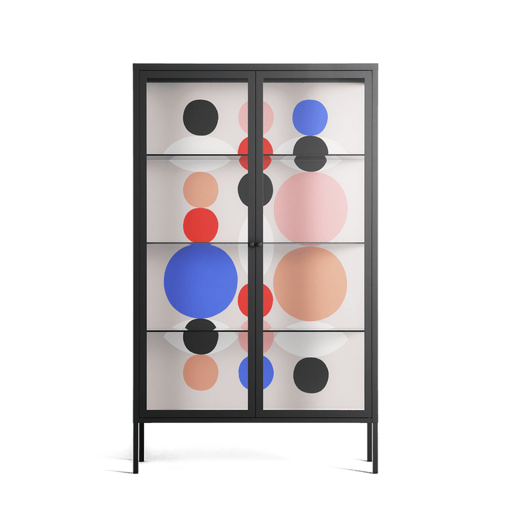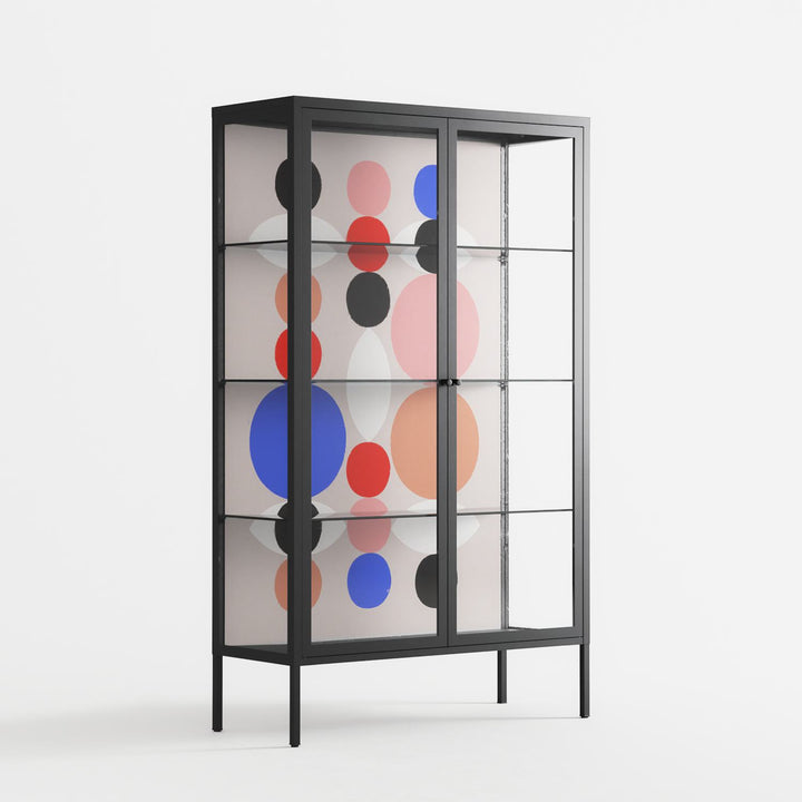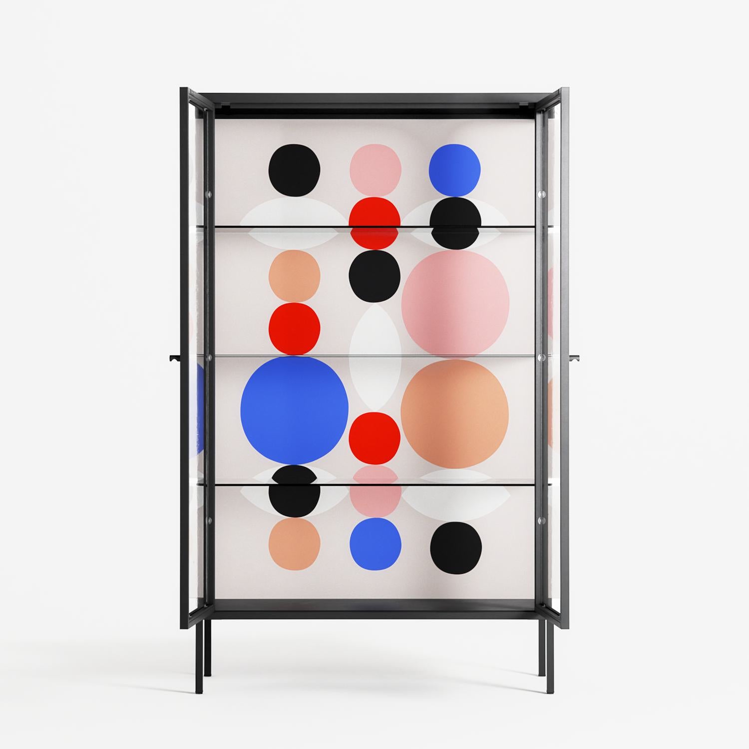 Pattern by David Vanadia, displayed within the Vitrine Cabinet behind Clear glass. Finished in the colour Antracite, the cabinet becomes a frame for the artwork and the objects within.