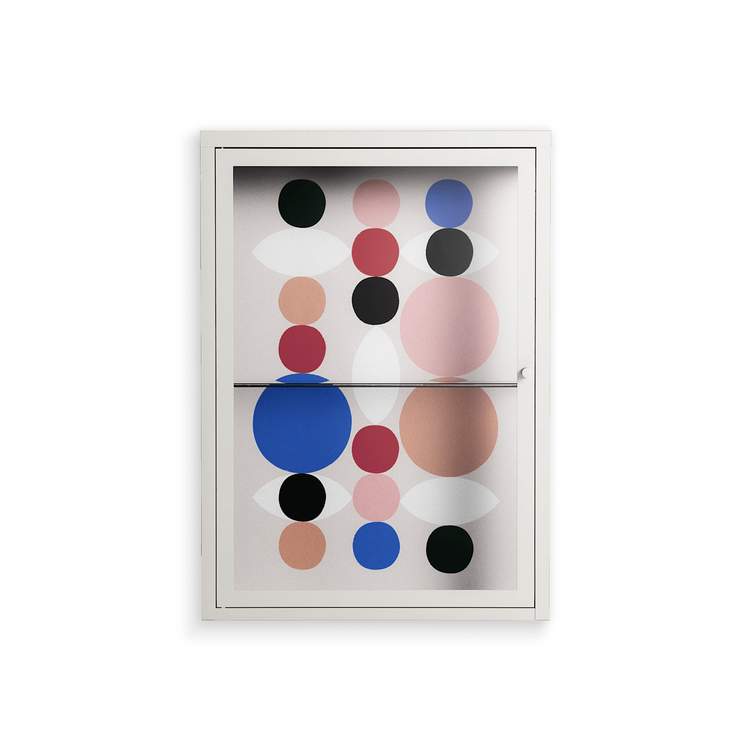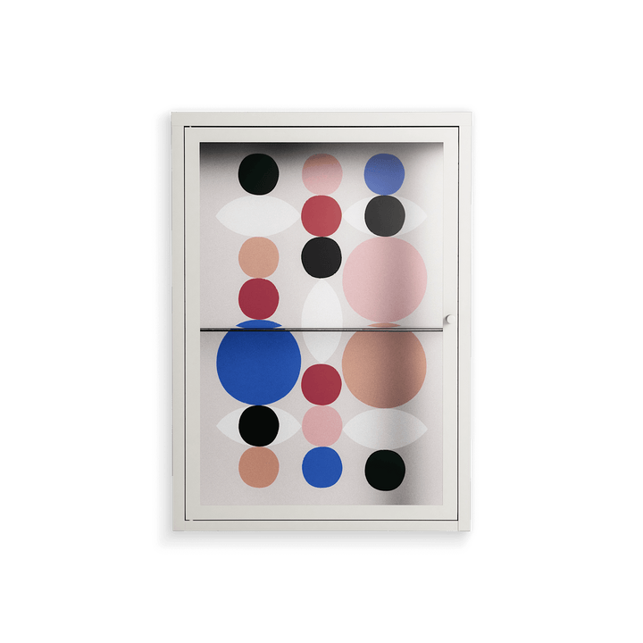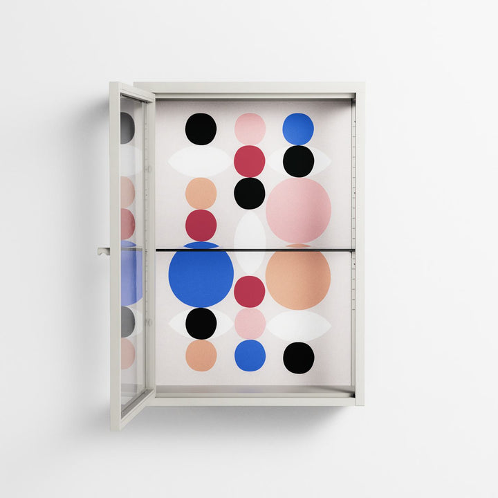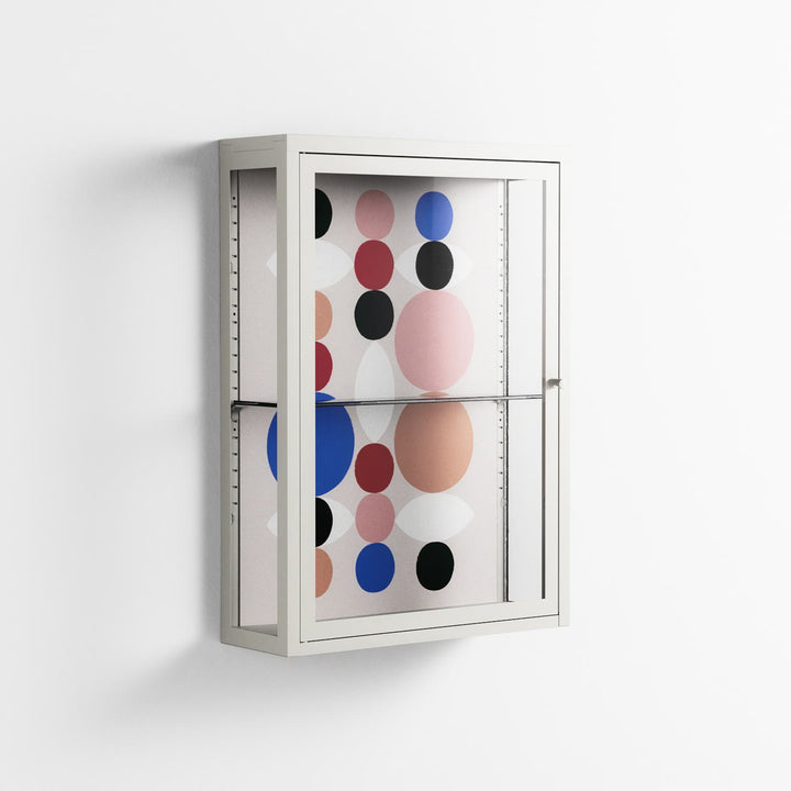 Pattern by David Vanadia, displayed within the Vitrine Wall Cabinet behind Clear glass. Finished in the colour Chalk, the cabinet becomes a frame for the artwork and the objects within.