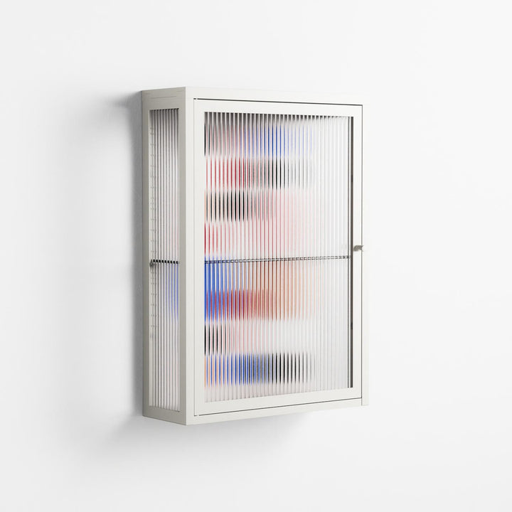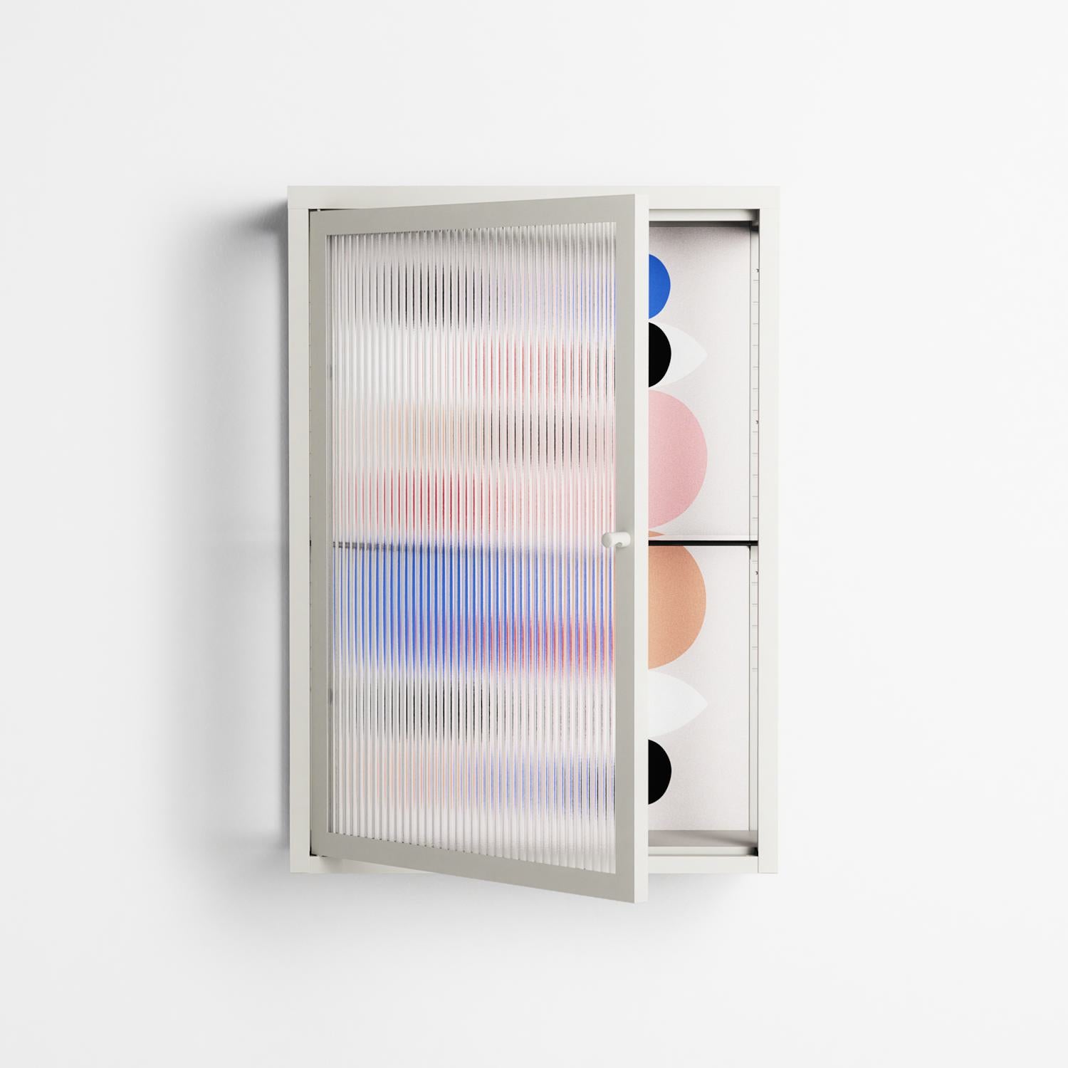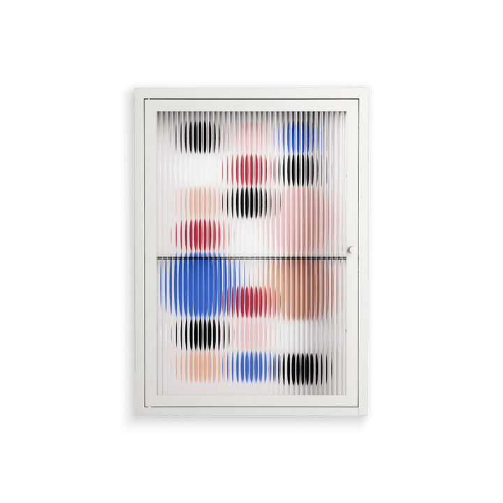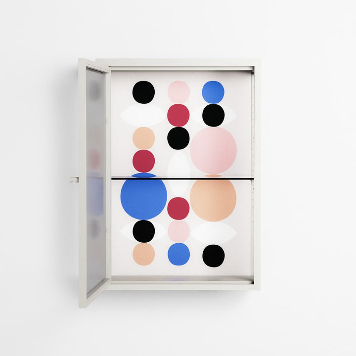 Pattern by David Vanadia, displayed within the Vitrine Wall Cabinet behind Reeded glass. Finished in the colour Chalk, the cabinet becomes a frame for the artwork and the objects within.