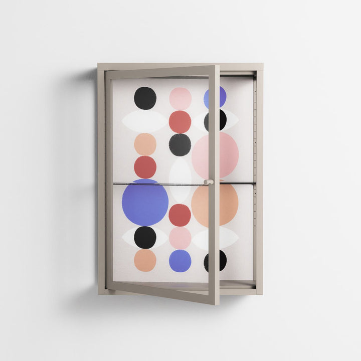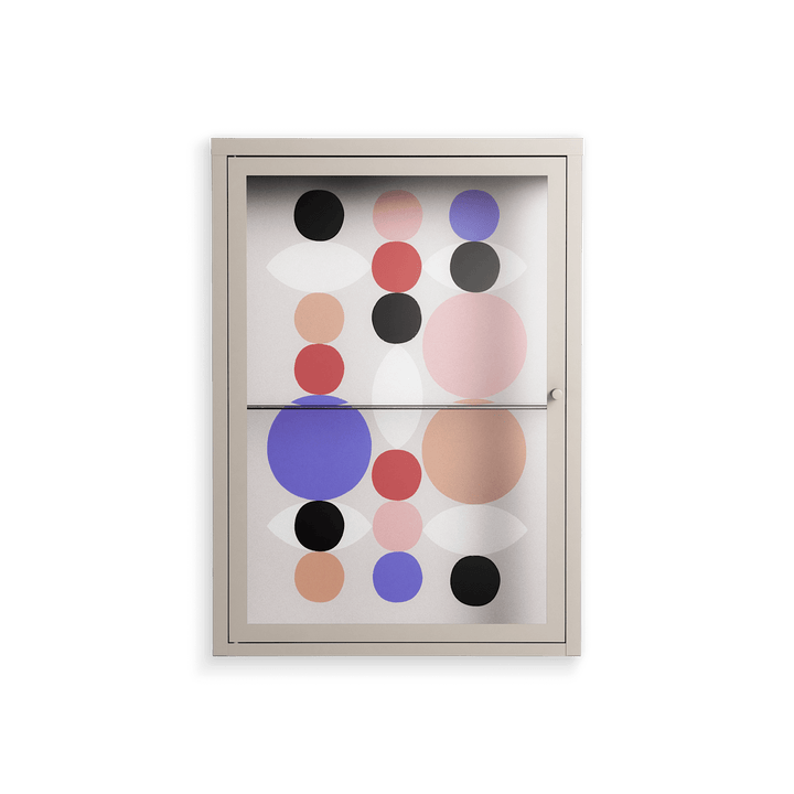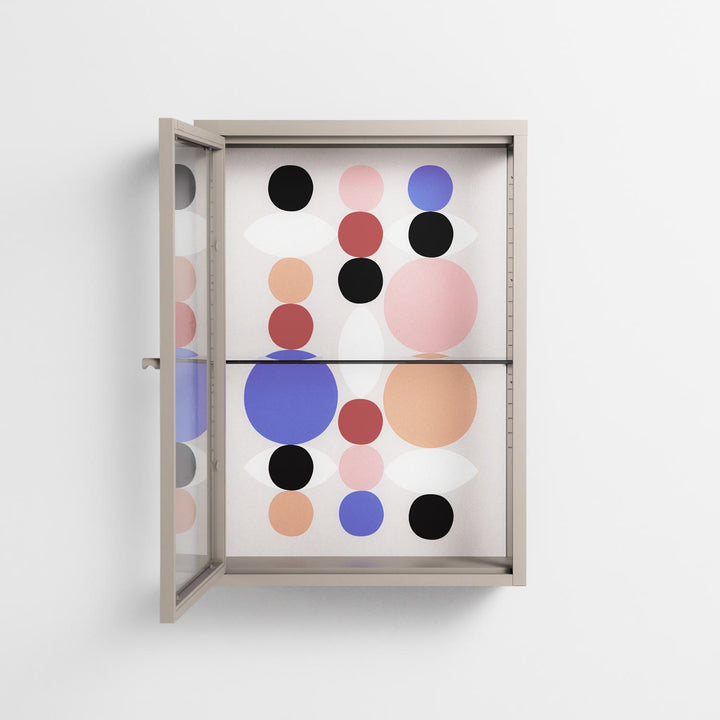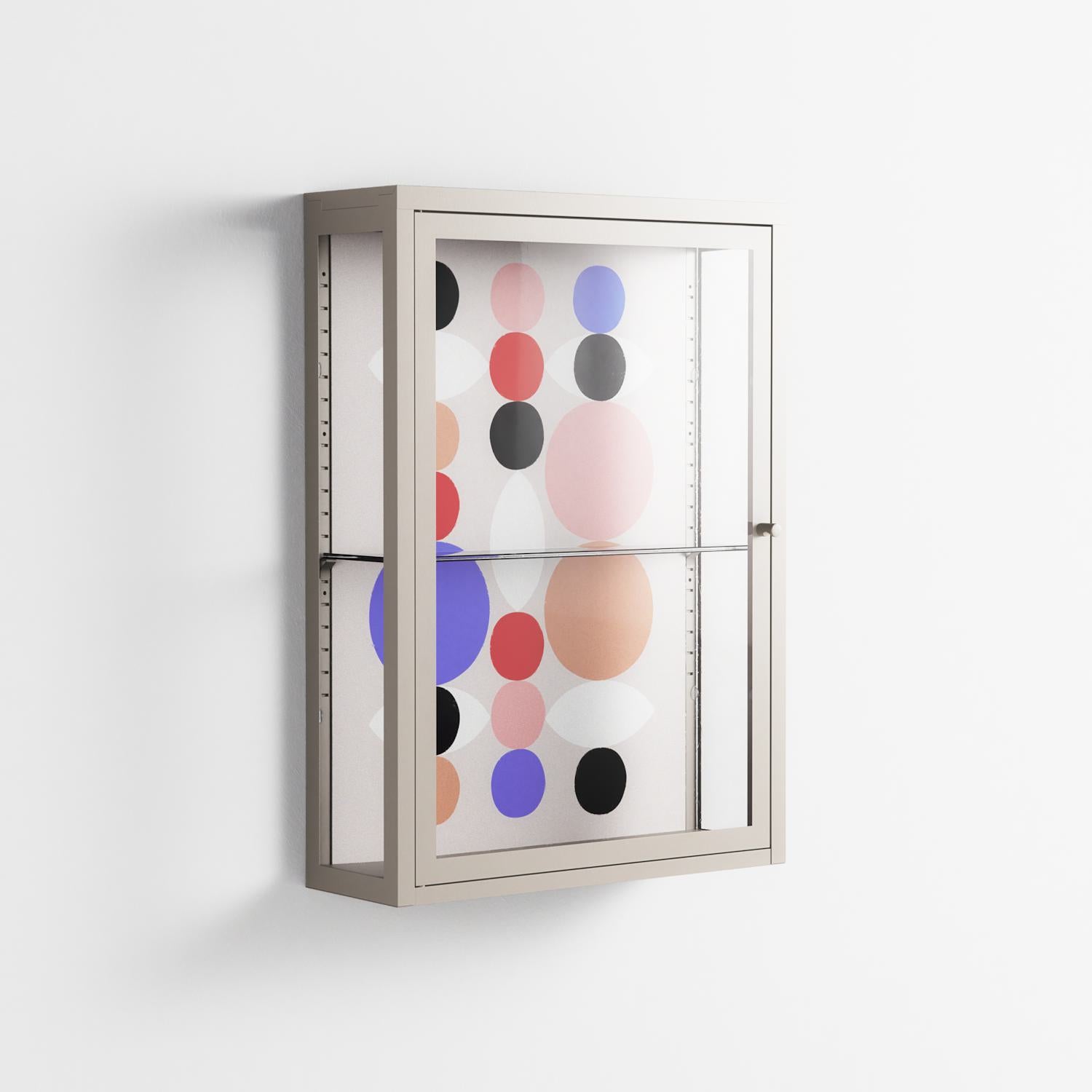 Pattern by David Vanadia, displayed within the Vitrine Wall Cabinet behind Clear glass. Finished in the colour Pebble, the cabinet becomes a frame for the artwork and the objects within.