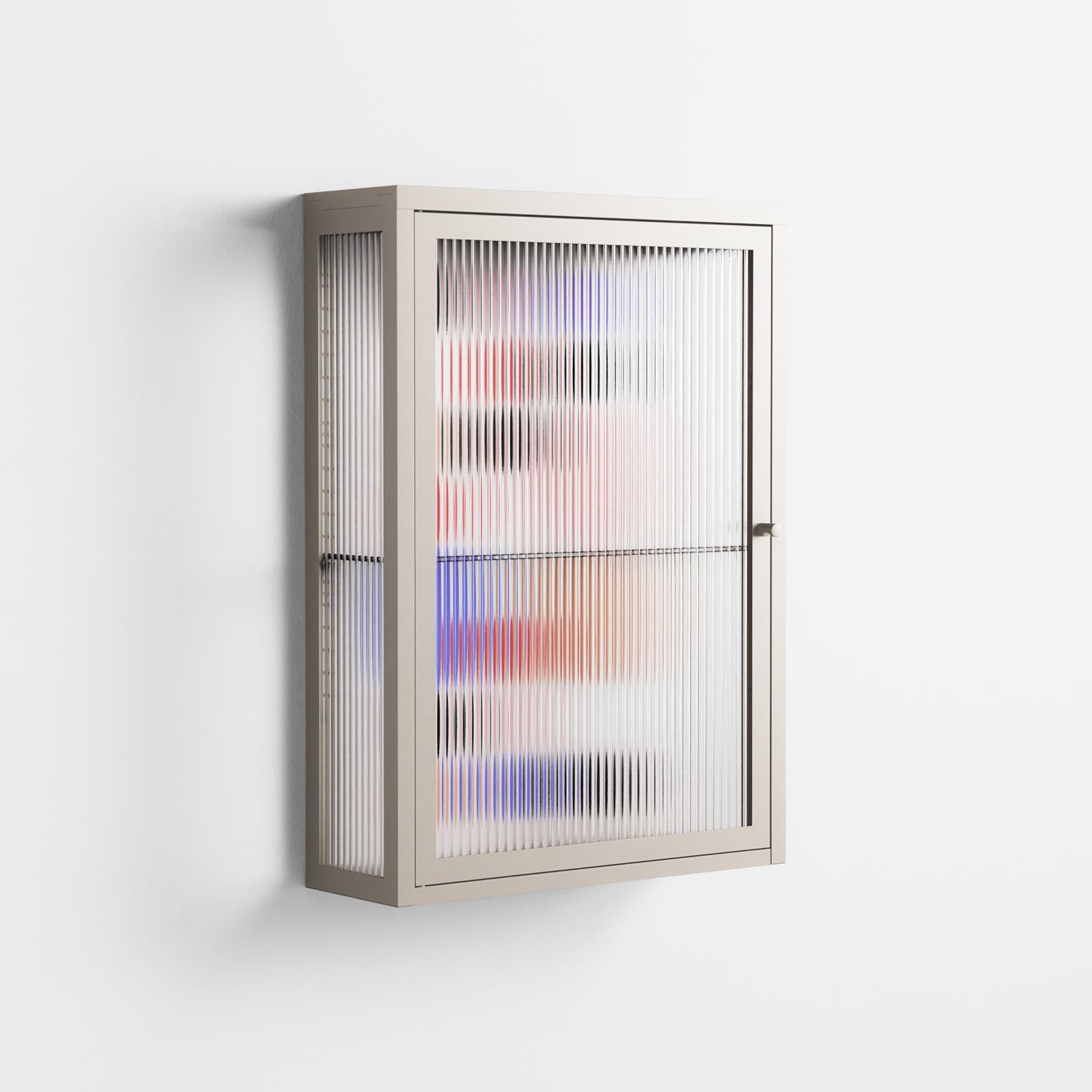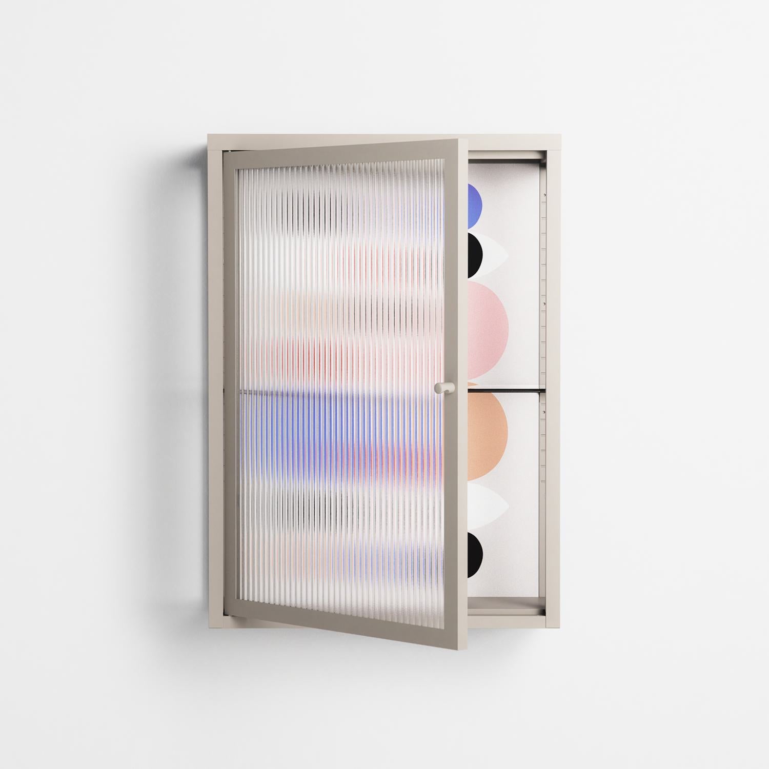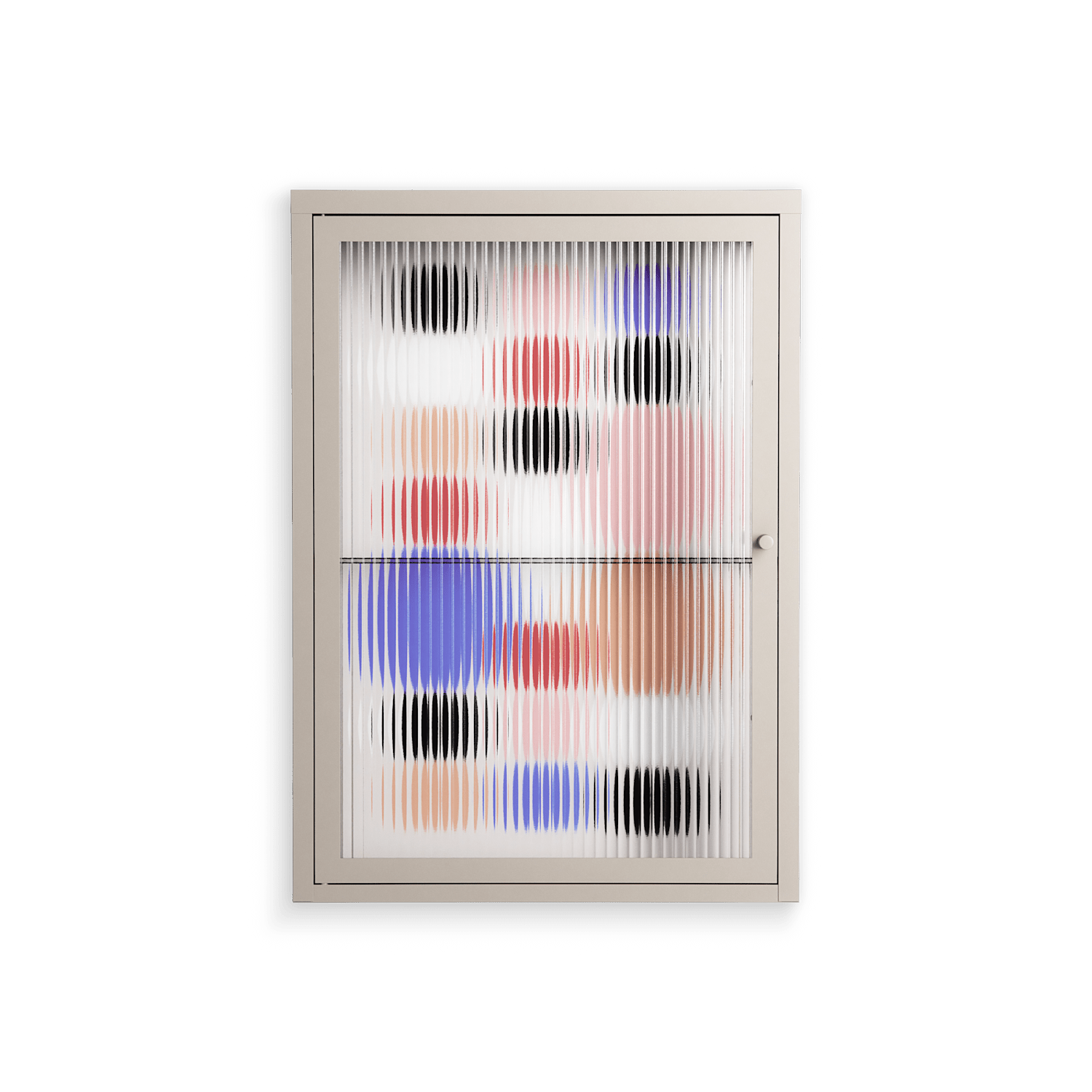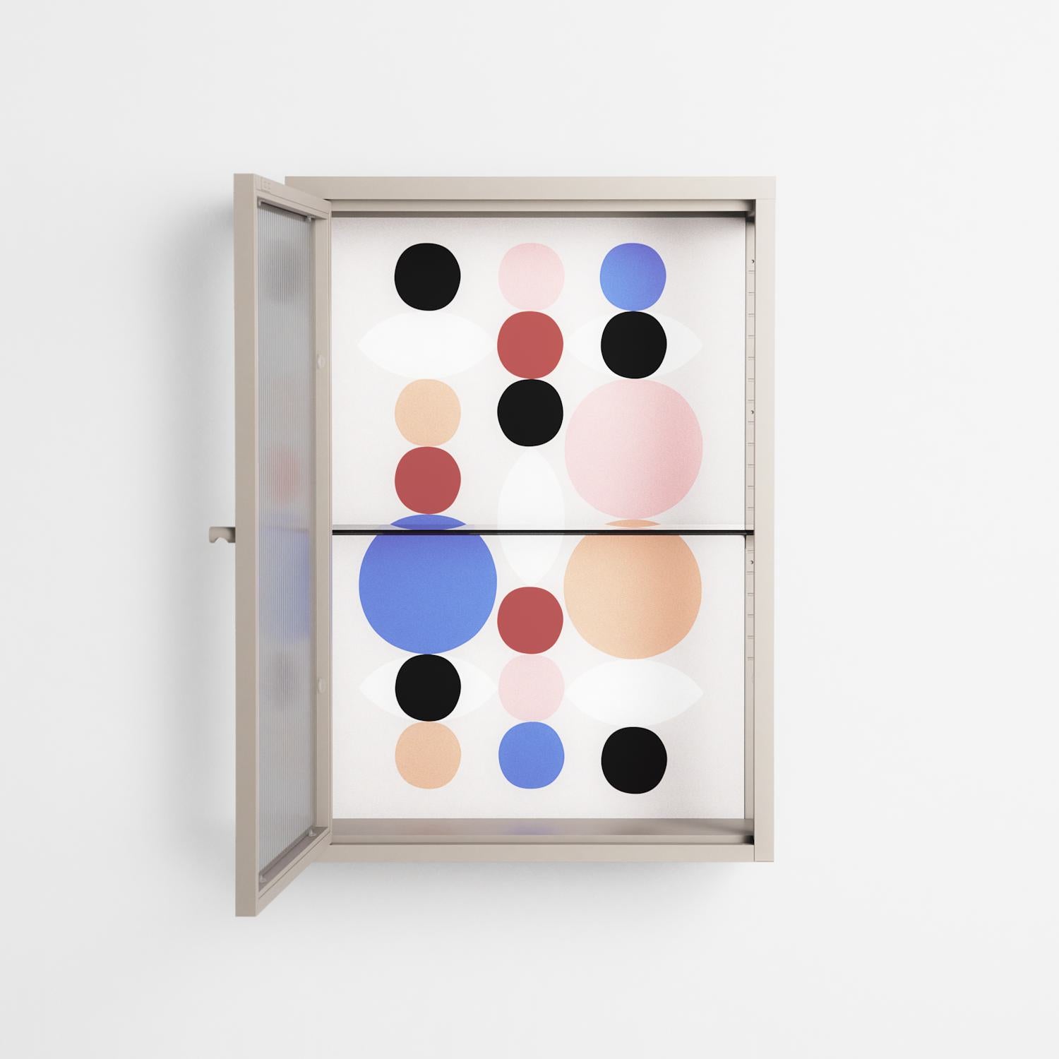 Pattern by David Vanadia, displayed within the Vitrine Wall Cabinet behind Reeded glass. Finished in the colour Pebble, the cabinet becomes a frame for the artwork and the objects within.