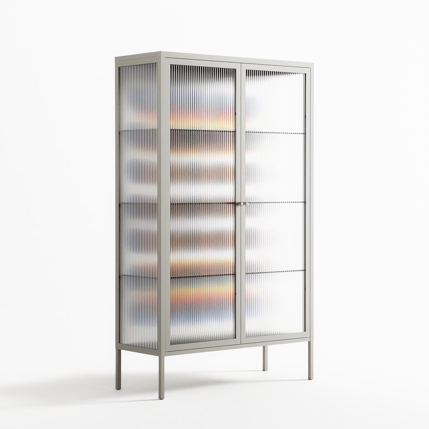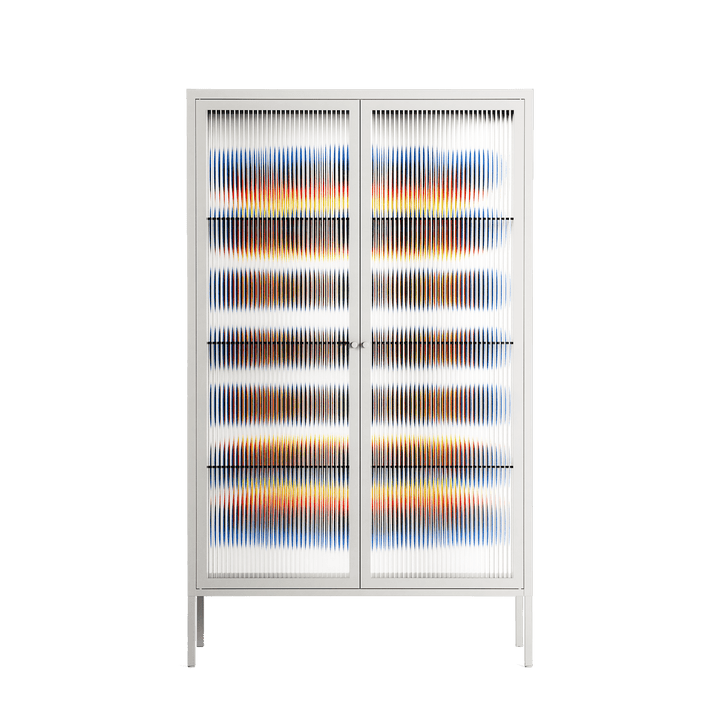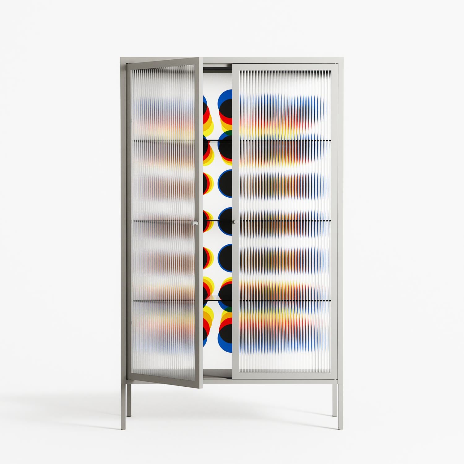 Perspektiva by Vratislav Pecka, displayed within the Vitrine Cabinet behind Reeded glass. Finished in the colour Chalk, the cabinet becomes a frame for the artwork and the objects within.