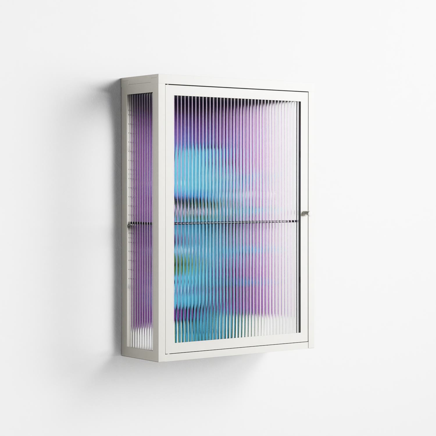 Punkrocker by Cezar Berje, displayed within the Vitrine Wall Cabinet behind Reeded glass. Finished in the colour Chalk, the cabinet becomes a frame for the artwork and the objects within.