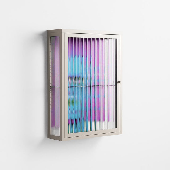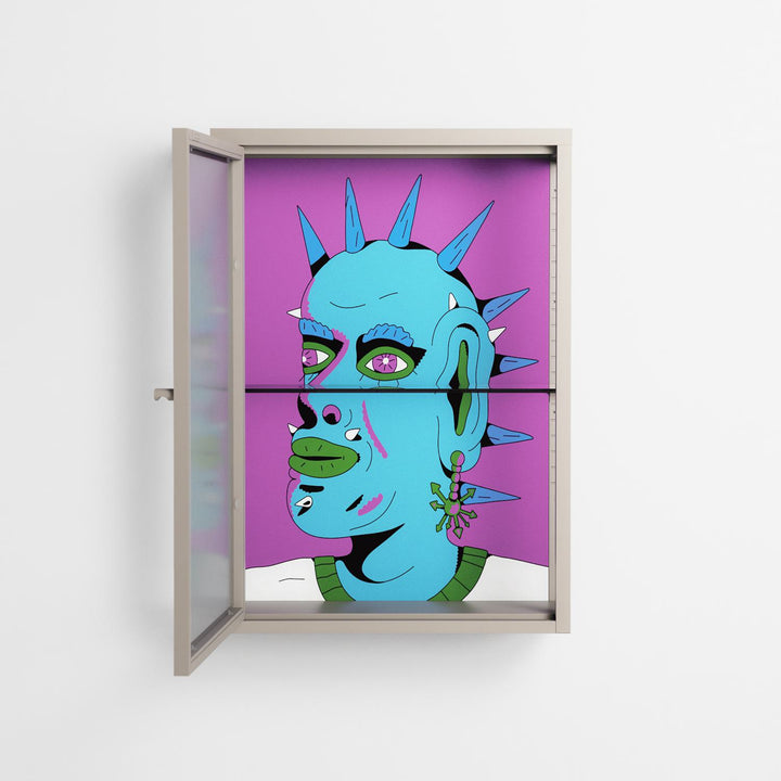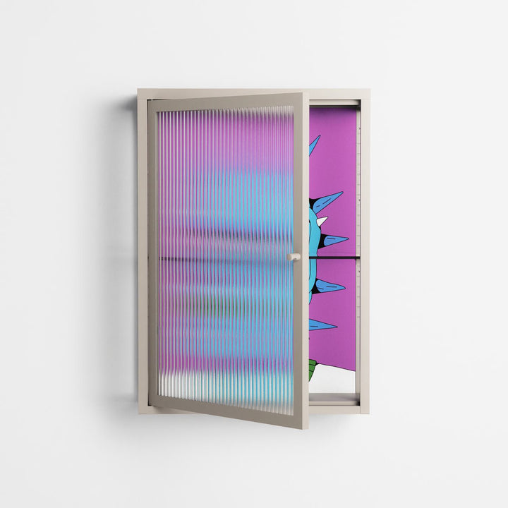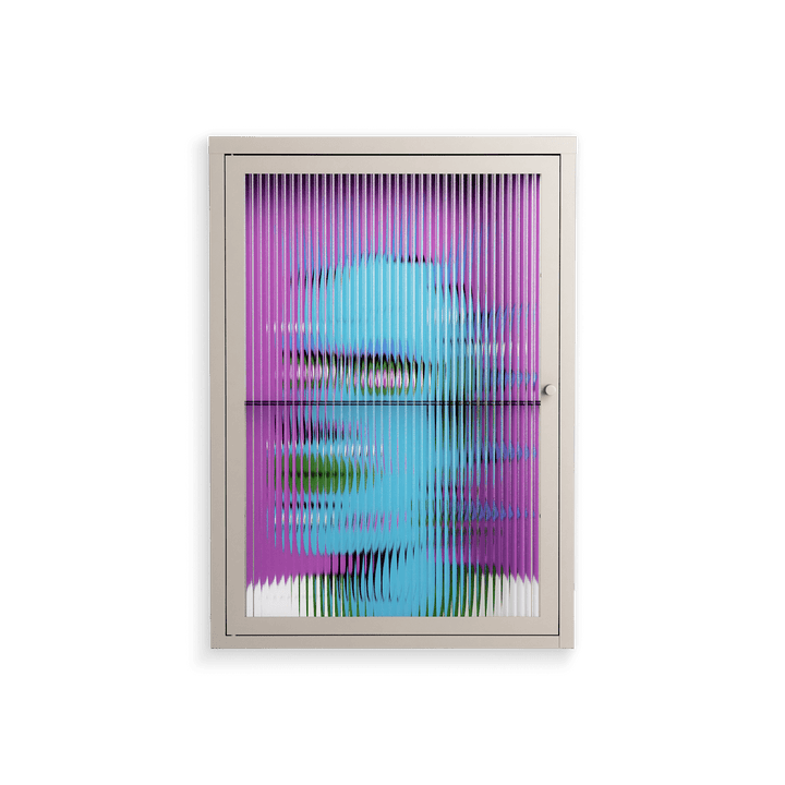 Punkrocker by Cezar Berje, displayed within the Vitrine Wall Cabinet behind Reeded glass. Finished in the colour Pebble, the cabinet becomes a frame for the artwork and the objects within.