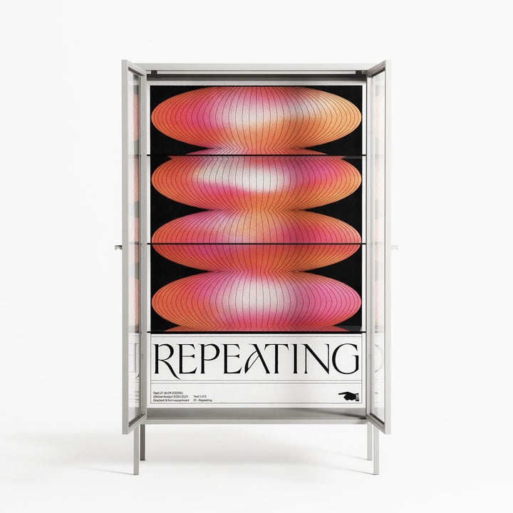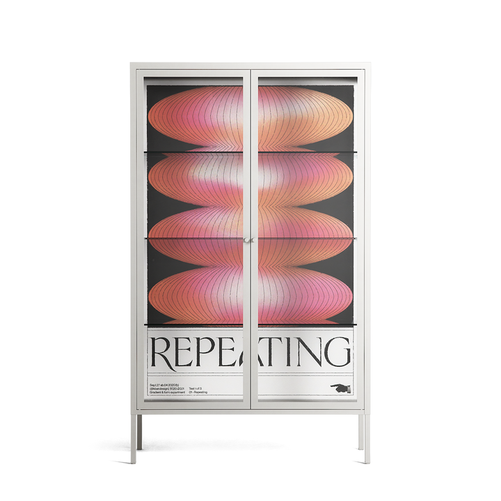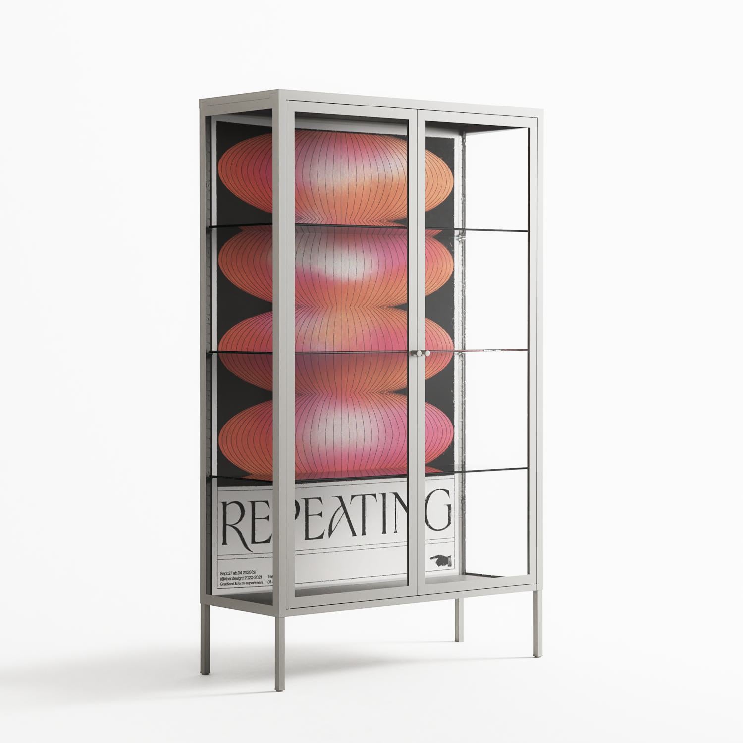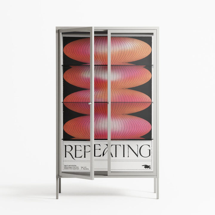 Repeating by Alexander Khabbazi, displayed within the Vitrine Cabinet behind Clear glass. Finished in the colour Chalk, the cabinet becomes a frame for the artwork and the objects within.