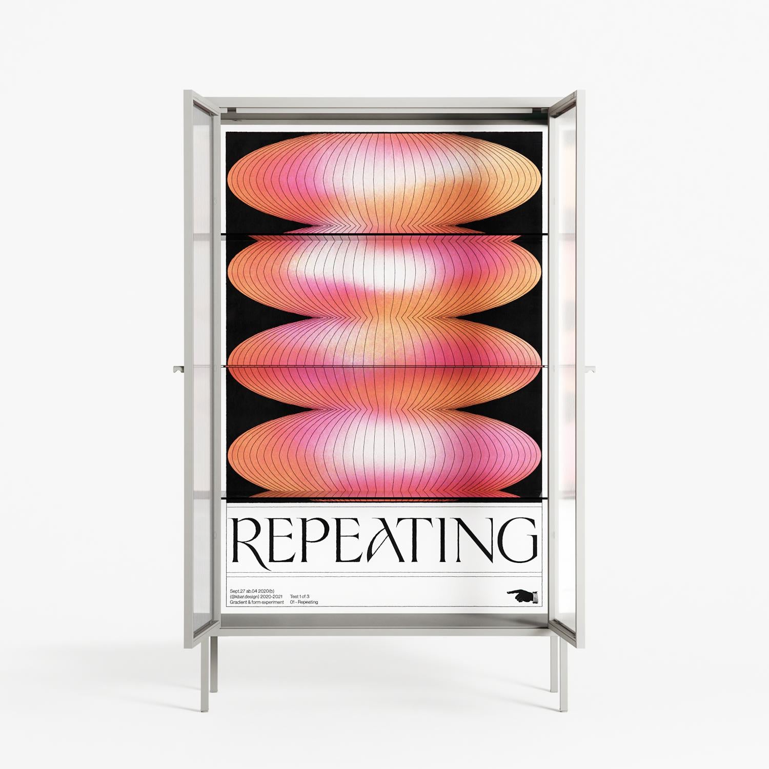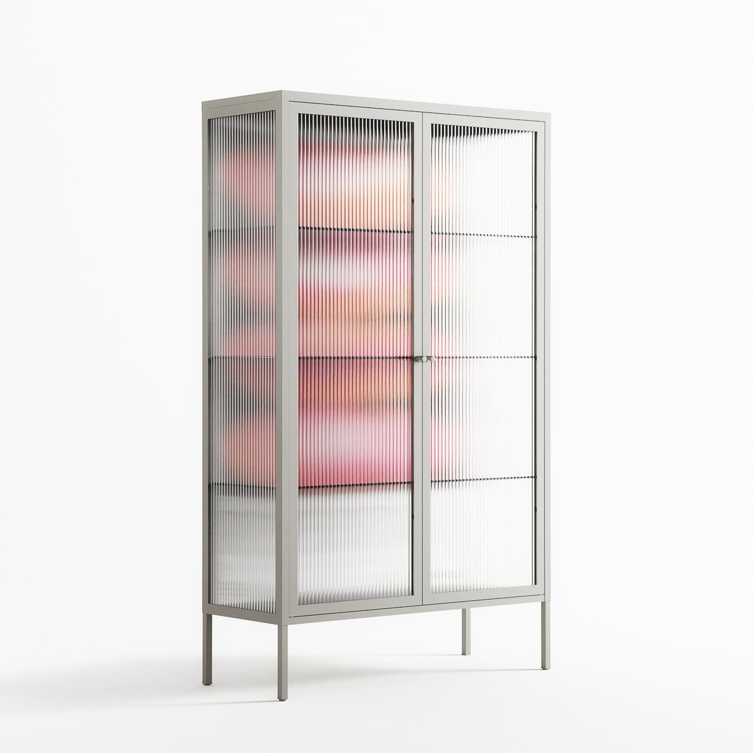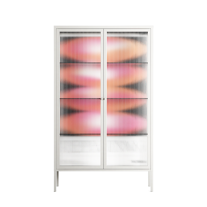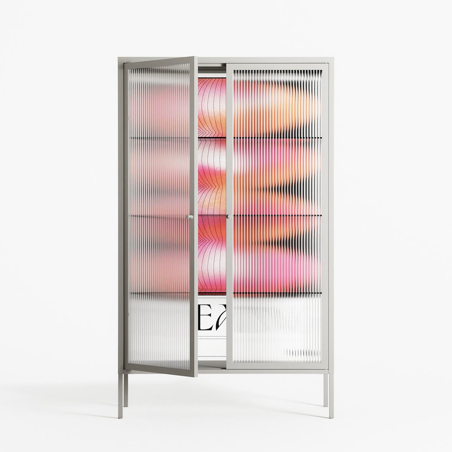 Repeating by Alexander Khabbazi, displayed within the Vitrine Cabinet behind Reeded glass. Finished in the colour Chalk, the cabinet becomes a frame for the artwork and the objects within.