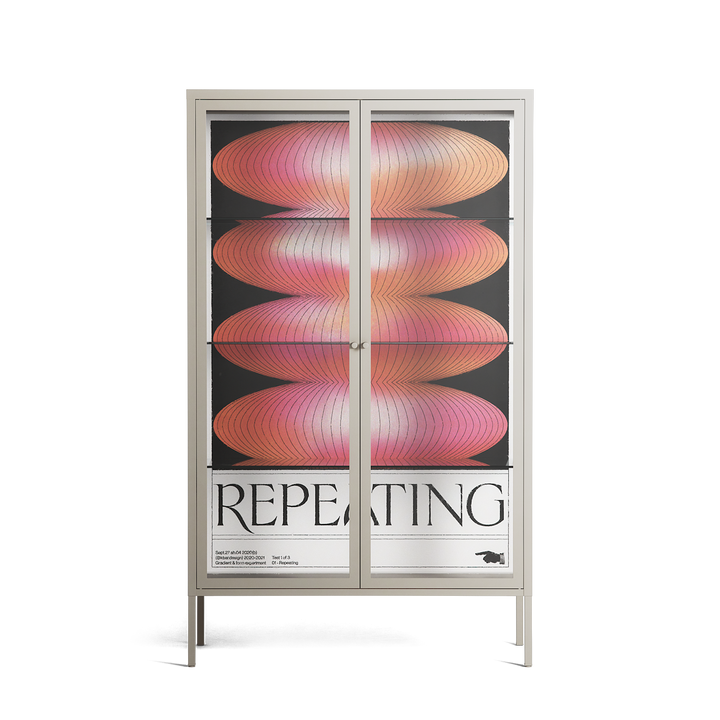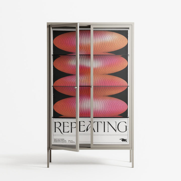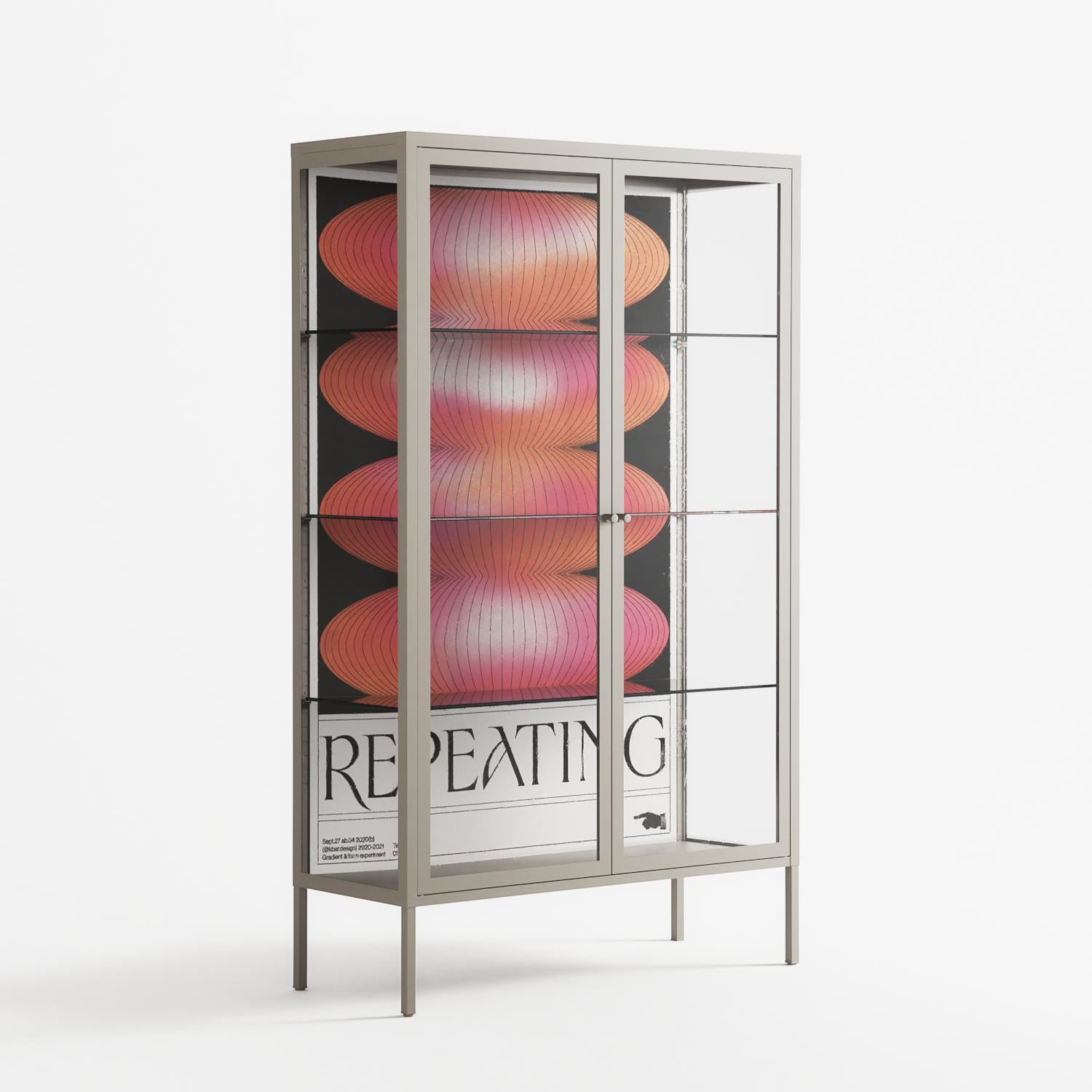 Repeating by Alexander Khabbazi, displayed within the Vitrine Cabinet behind Clear glass. Finished in the colour Pebble, the cabinet becomes a frame for the artwork and the objects within.