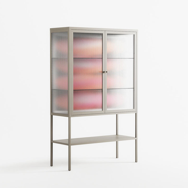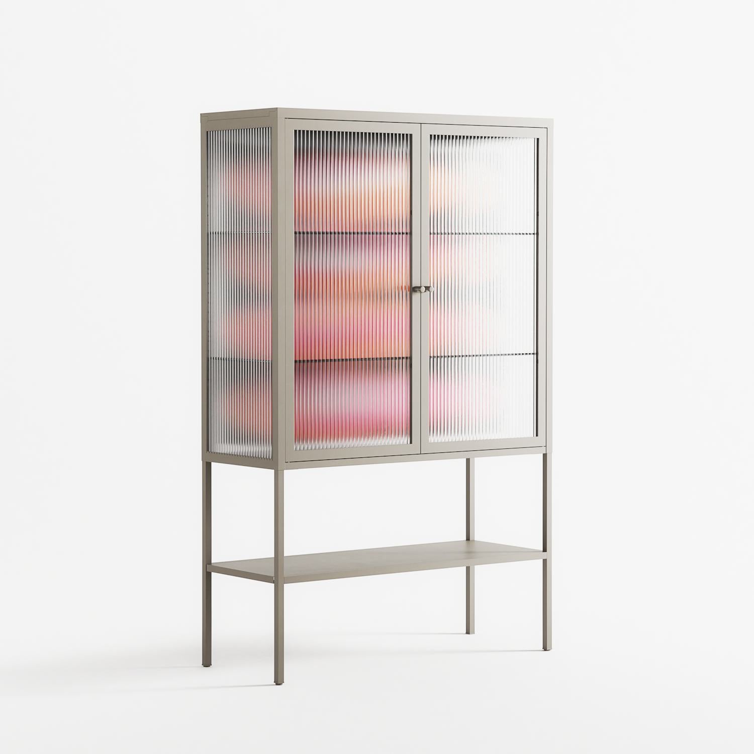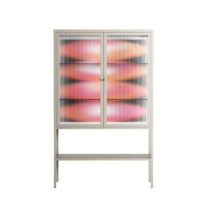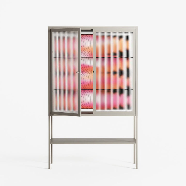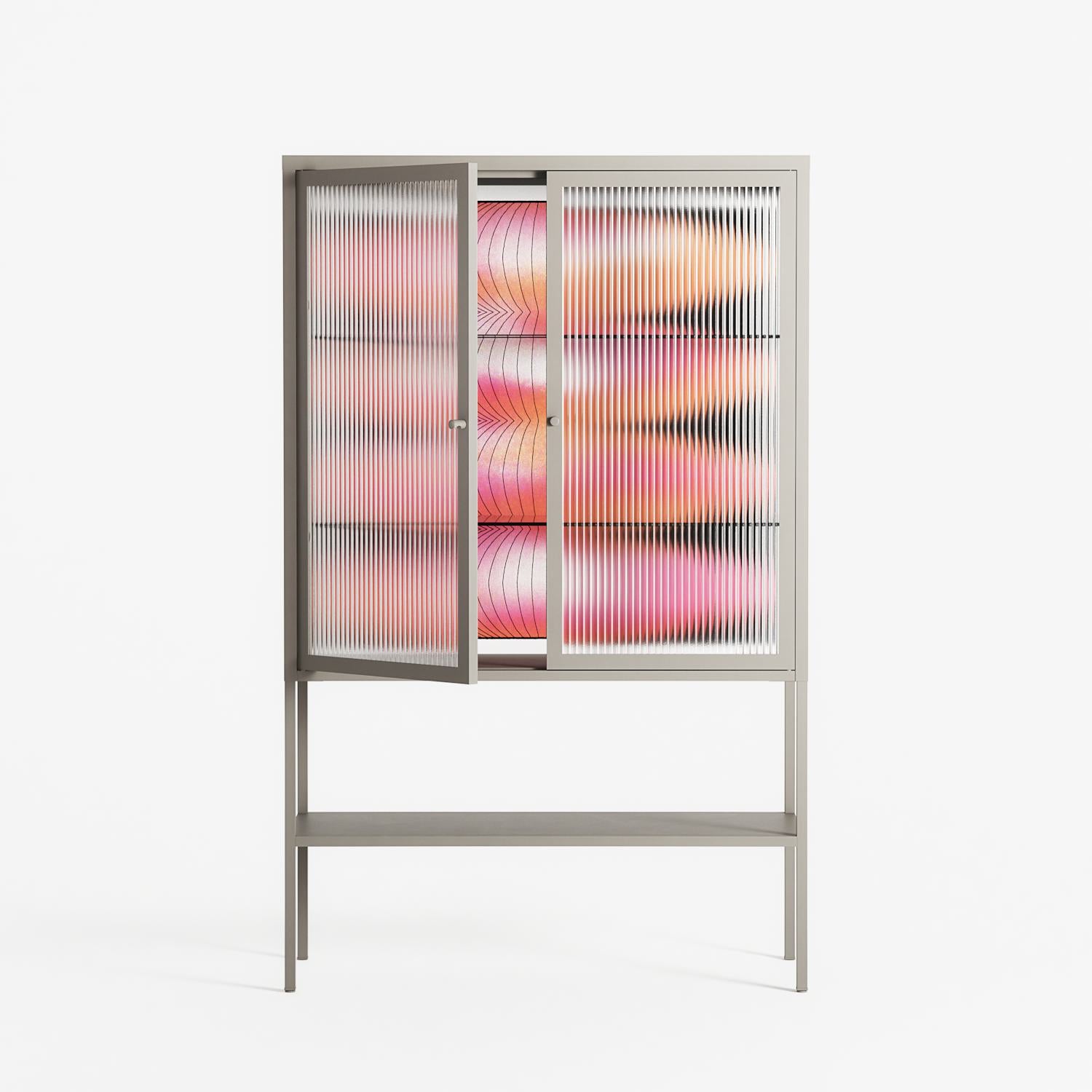 Repeating by Alexander Khabbazi, displayed within the Vitrine Loft Cabinet behind Reeded glass. Finished in the colour Pebble, the cabinet becomes a frame for the artwork and the objects within.