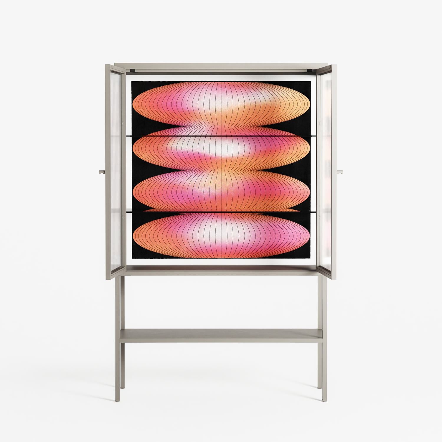Vitrine pairs artworks by artists, designers, and creatives from around the world with a frame that elevates and displays them in everyday space. The cabinet is built from precision-cut metal with a powder-coated finish — resistant to wear and crafted for stability — making it ideal for both office and home spaces.