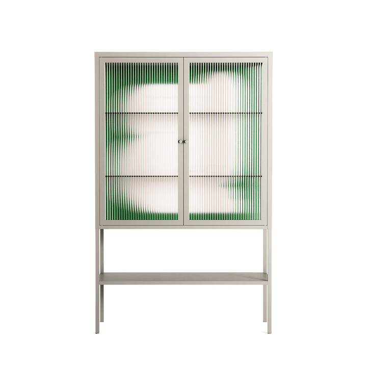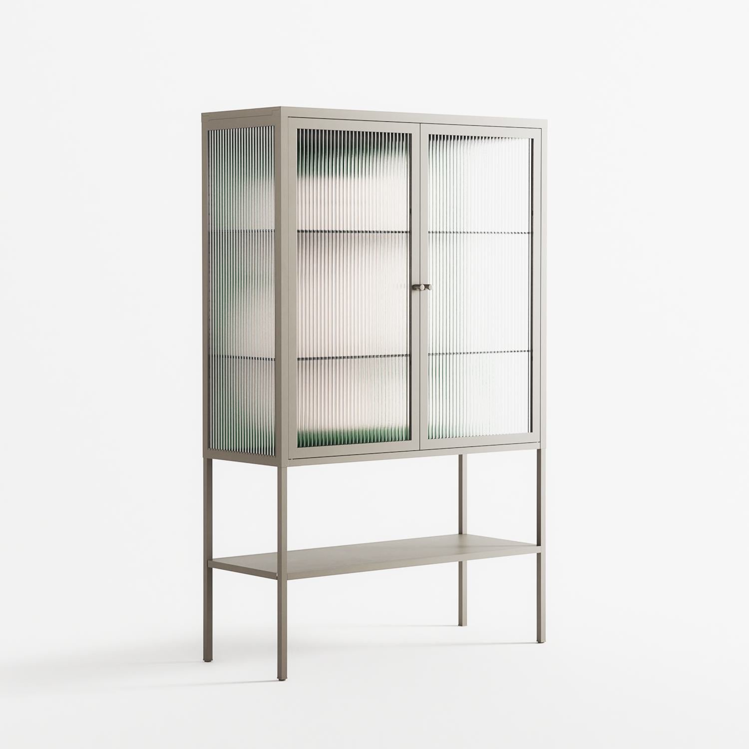 Rest 1 by Andrea Devia-Nuño, displayed within the Vitrine Loft Cabinet behind Reeded glass. Finished in the colour Pebble, the cabinet becomes a frame for the artwork and the objects within.