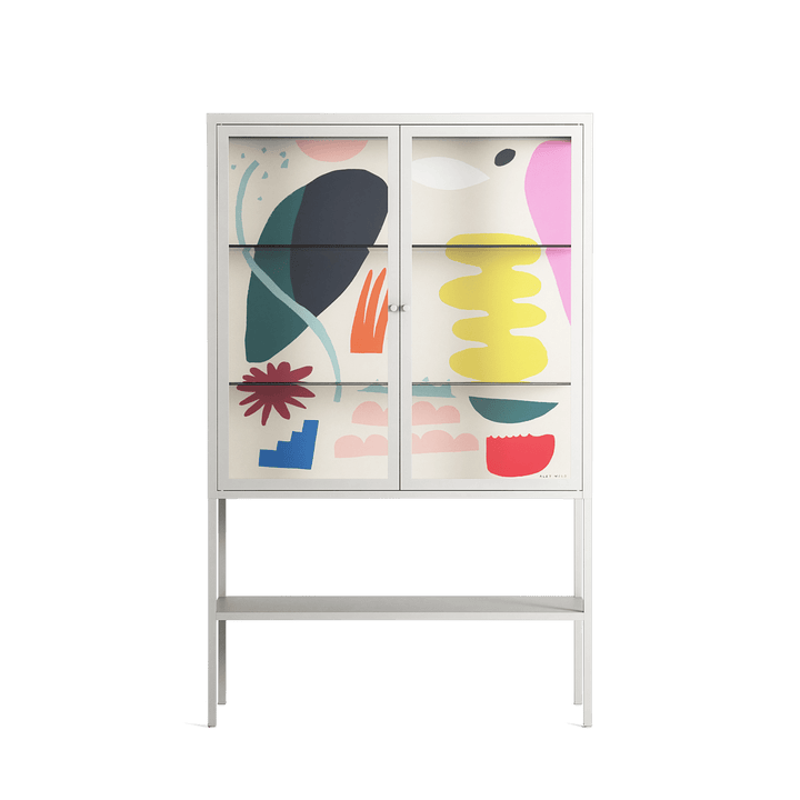 Sea Shapes by Aley Wild, displayed within the Vitrine Loft Cabinet behind Clear glass. Finished in the colour Chalk, the cabinet becomes a frame for the artwork and the objects within.
