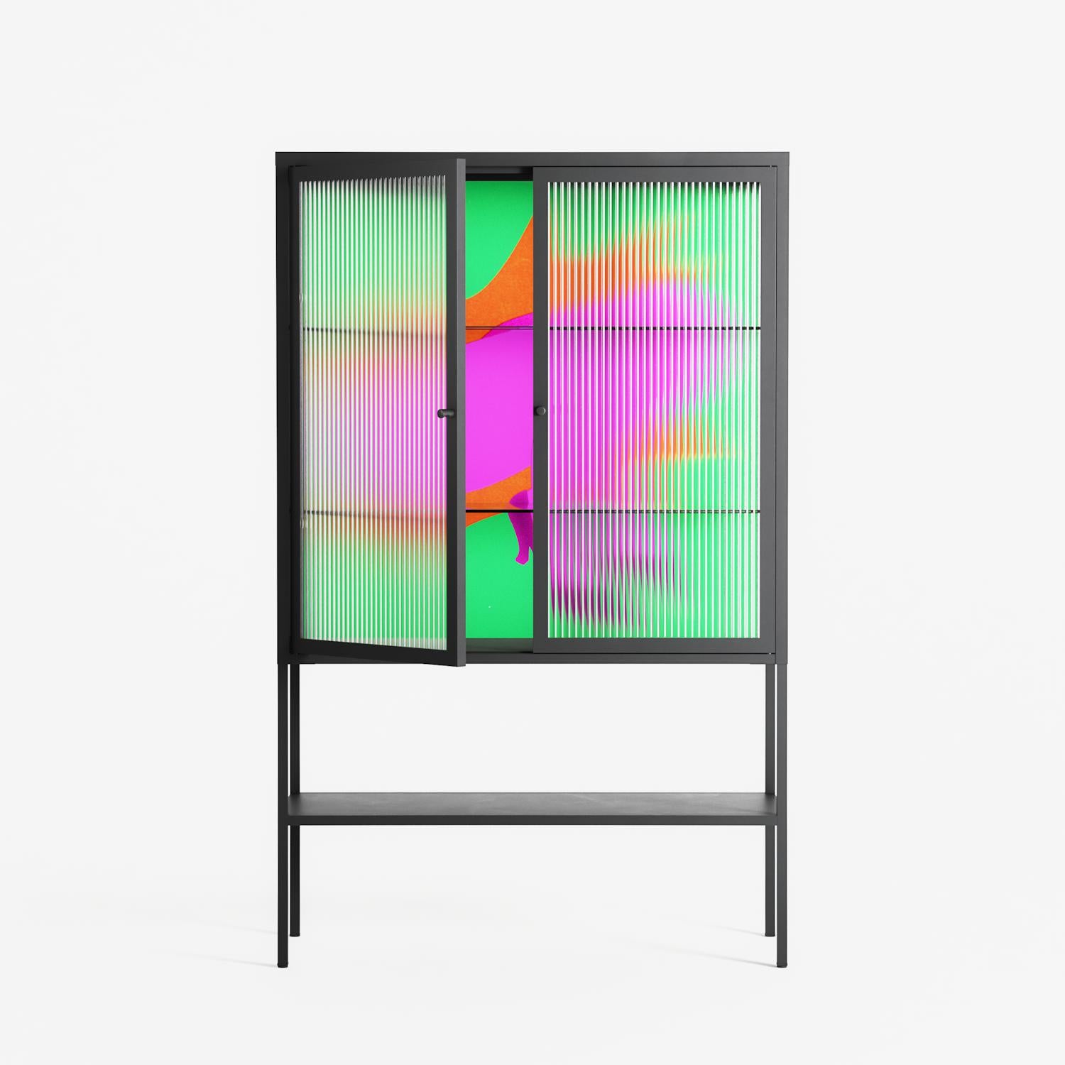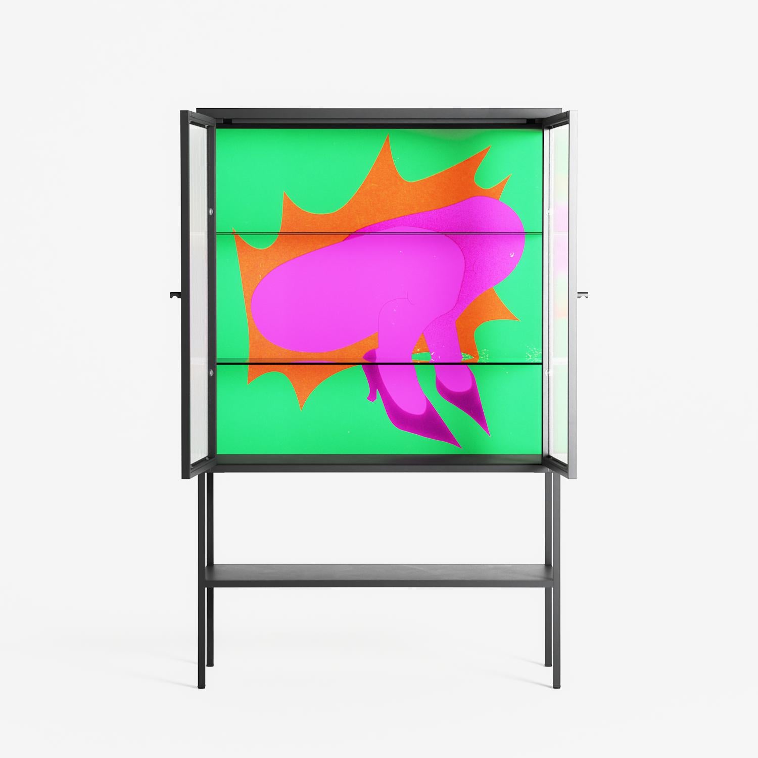 Vitrine pairs artworks by artists, designers, and creatives from around the world with a frame that elevates and displays them in everyday space. The cabinet is built from precision-cut metal with a powder-coated finish — resistant to wear and crafted for stability — making it ideal for both office and home spaces.