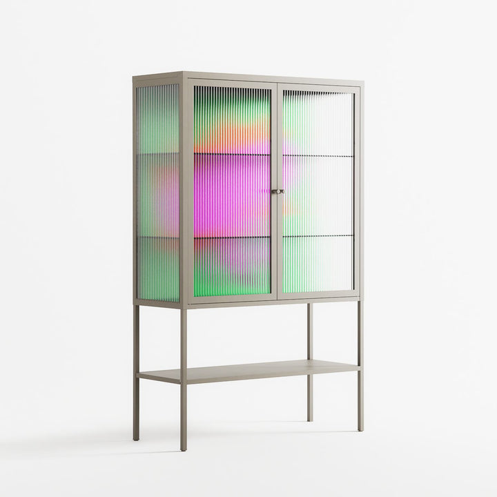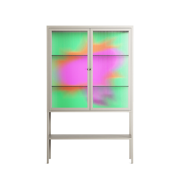 Sit This One Out by Ciara Wade, displayed within the Vitrine Loft Cabinet behind Reeded glass. Finished in the colour Pebble, the cabinet becomes a frame for the artwork and the objects within.