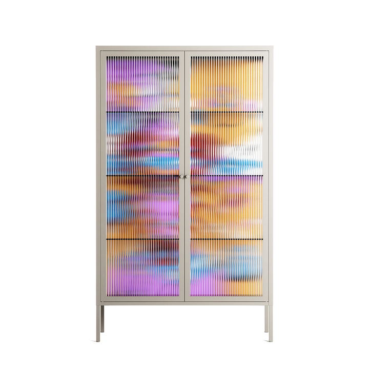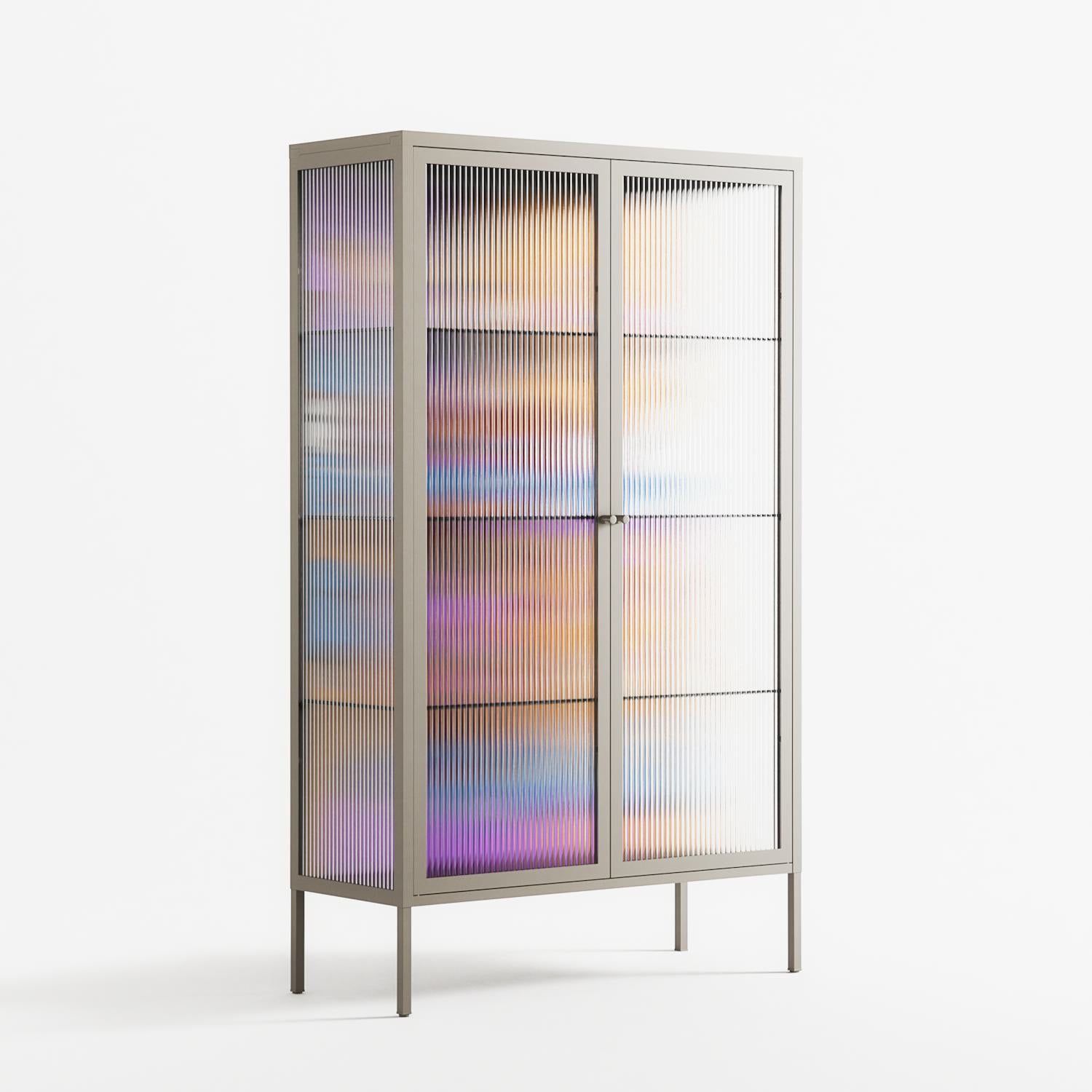 Solar Cancer by Cezar Berje, displayed within the Vitrine Cabinet behind Reeded glass. Finished in the colour Pebble, the cabinet becomes a frame for the artwork and the objects within.