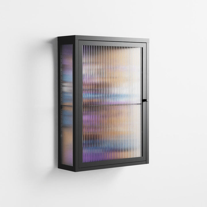 Solar Cancer by Cezar Berje, displayed within the Vitrine Wall Cabinet behind Reeded glass. Finished in the colour Antracite, the cabinet becomes a frame for the artwork and the objects within.