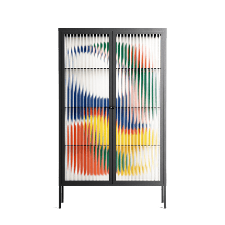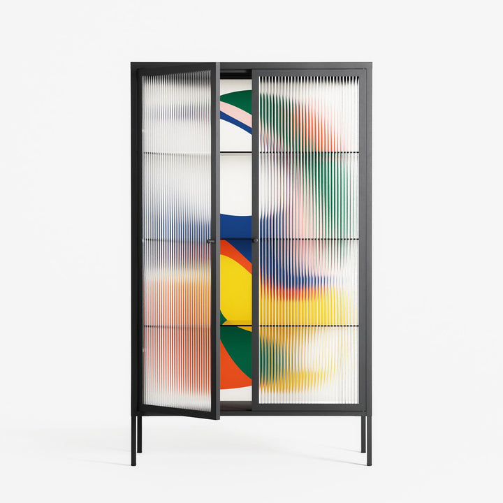 Spilled Paint by Vratislav Pecka, displayed within the Vitrine Cabinet behind Reeded glass. Finished in the colour Antracite, the cabinet becomes a frame for the artwork and the objects within.