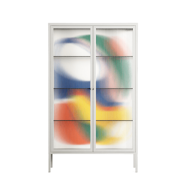 Spilled Paint by Vratislav Pecka, displayed within the Vitrine Cabinet behind Reeded glass. Finished in the colour Chalk, the cabinet becomes a frame for the artwork and the objects within.