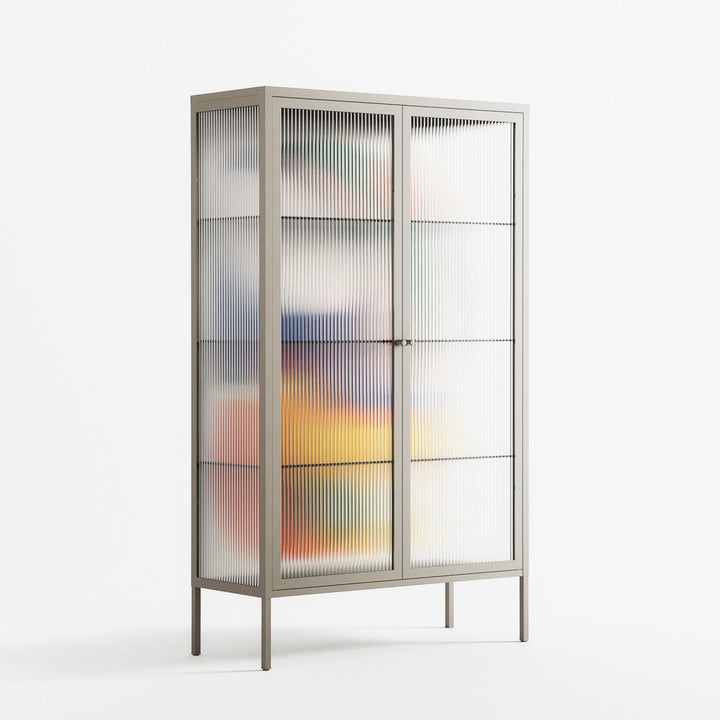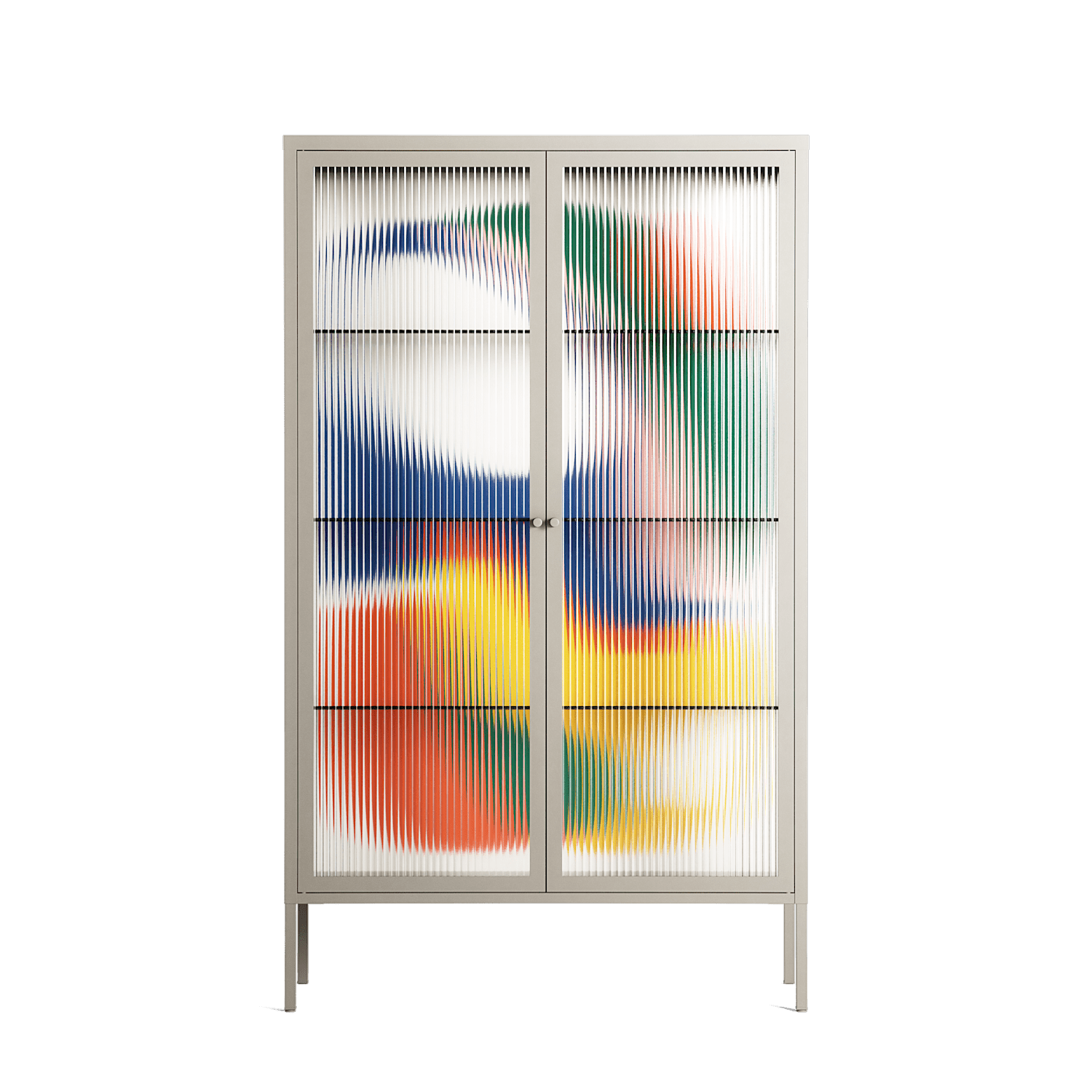 Spilled Paint by Vratislav Pecka, displayed within the Vitrine Cabinet behind Reeded glass. Finished in the colour Pebble, the cabinet becomes a frame for the artwork and the objects within.