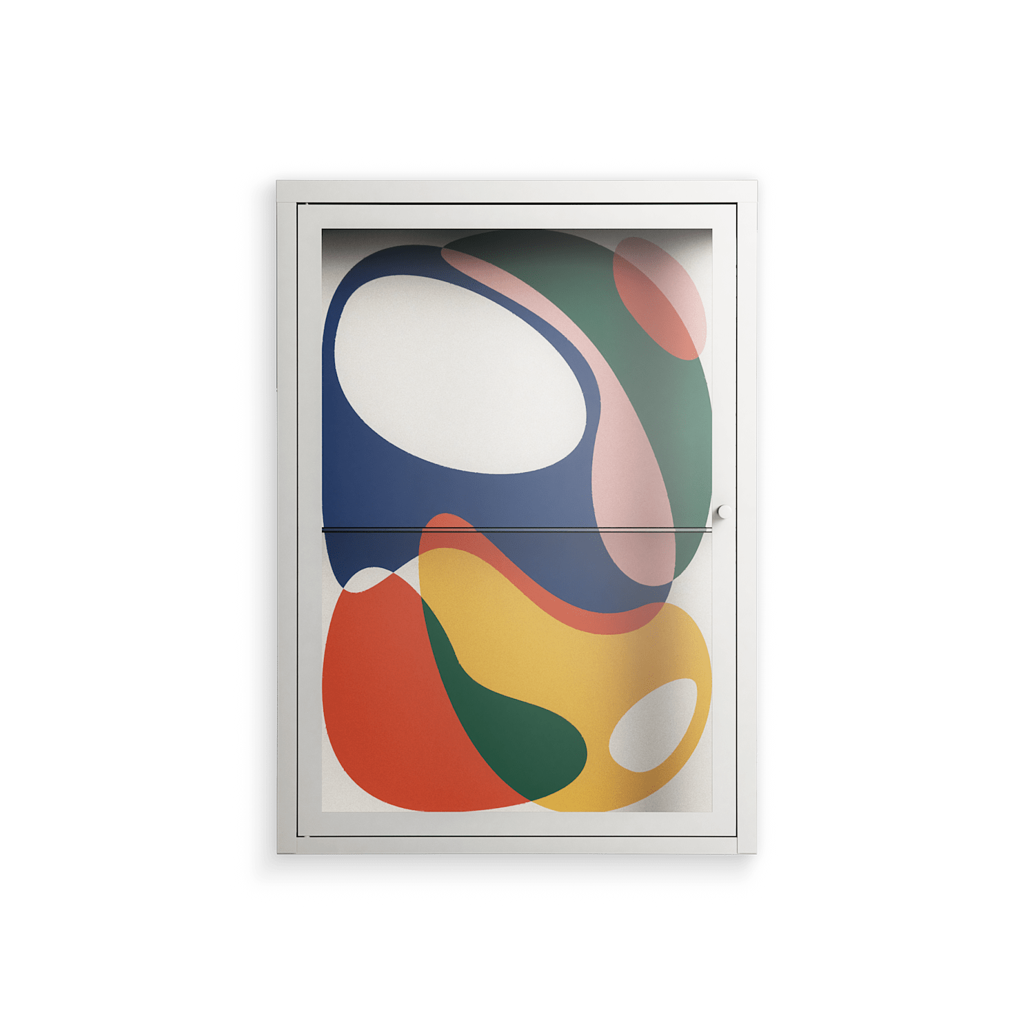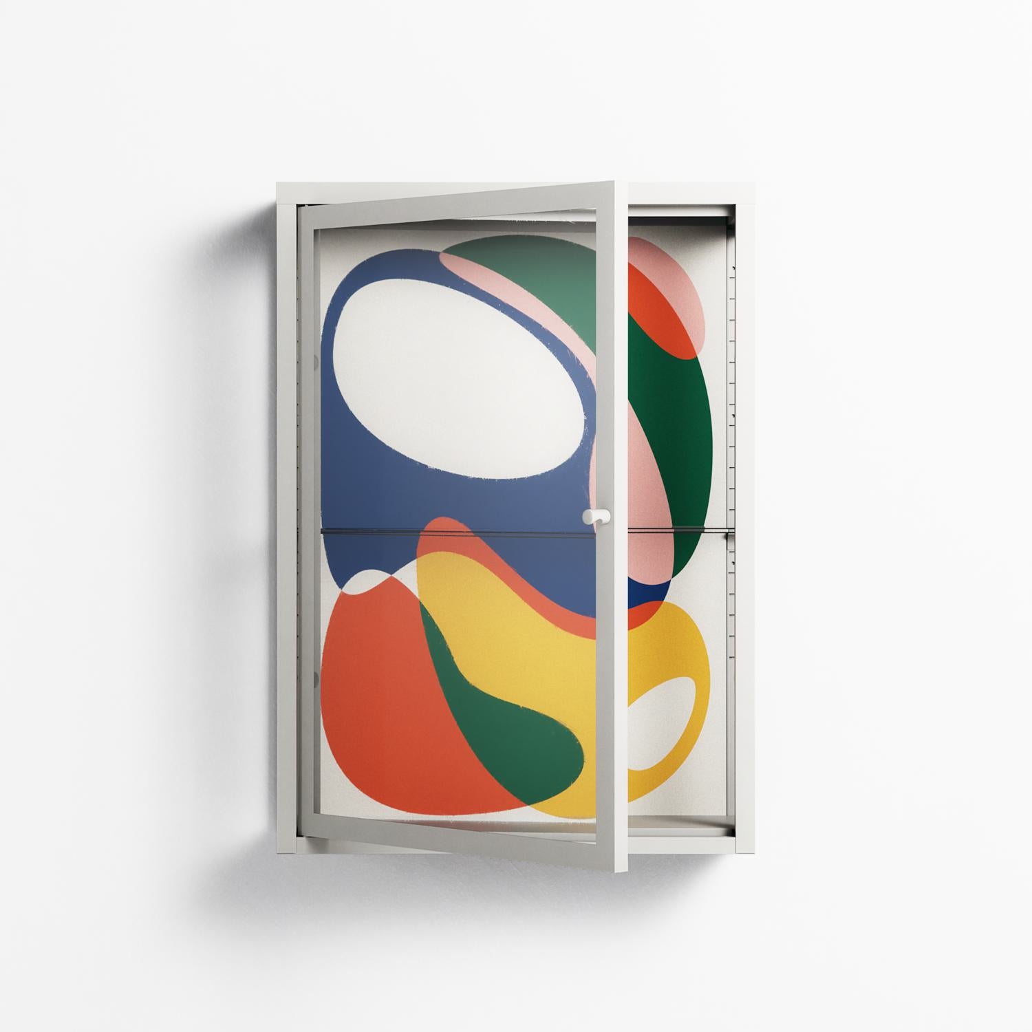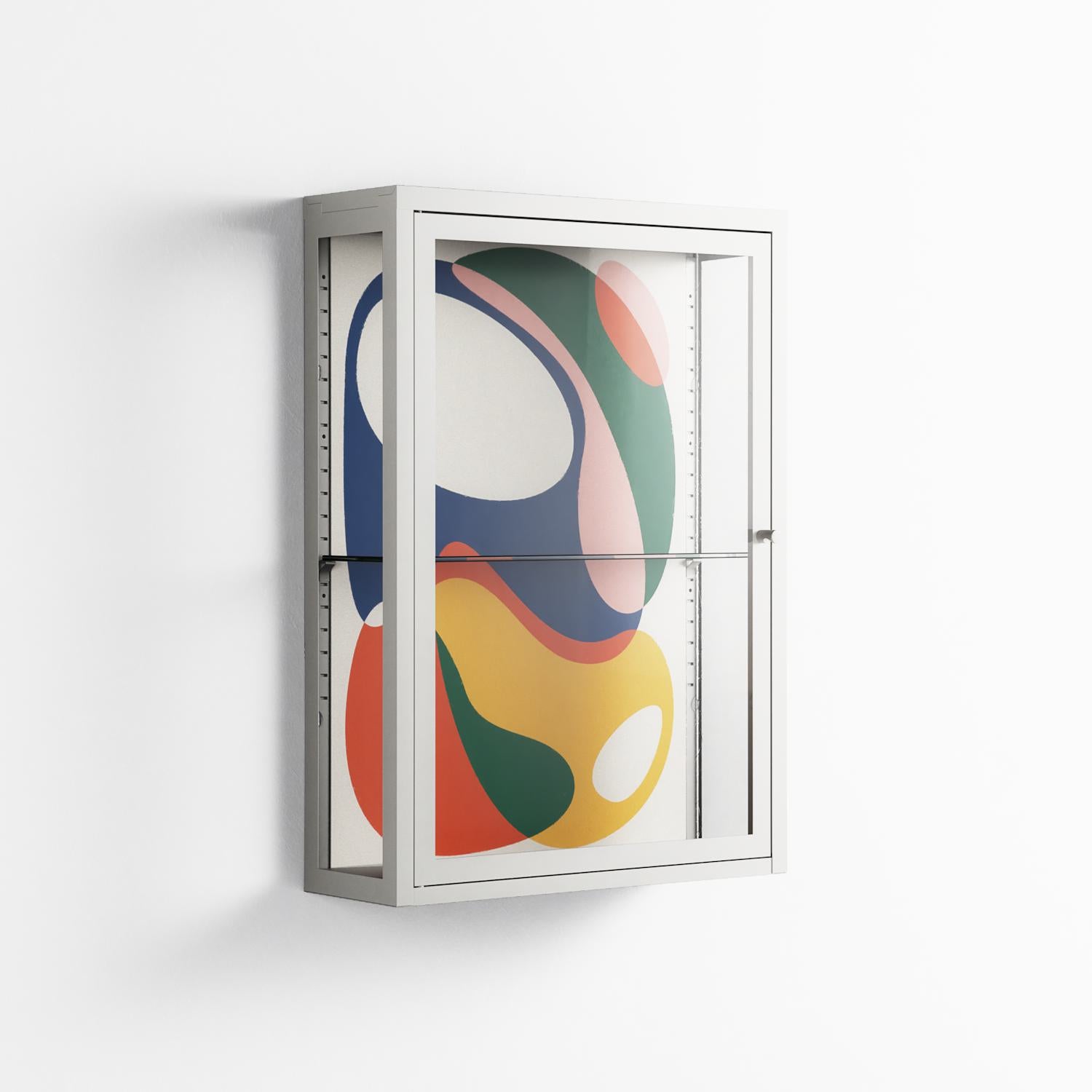 Spilled Paint by Vratislav Pecka, displayed within the Vitrine Wall Cabinet behind Clear glass. Finished in the colour Chalk, the cabinet becomes a frame for the artwork and the objects within.