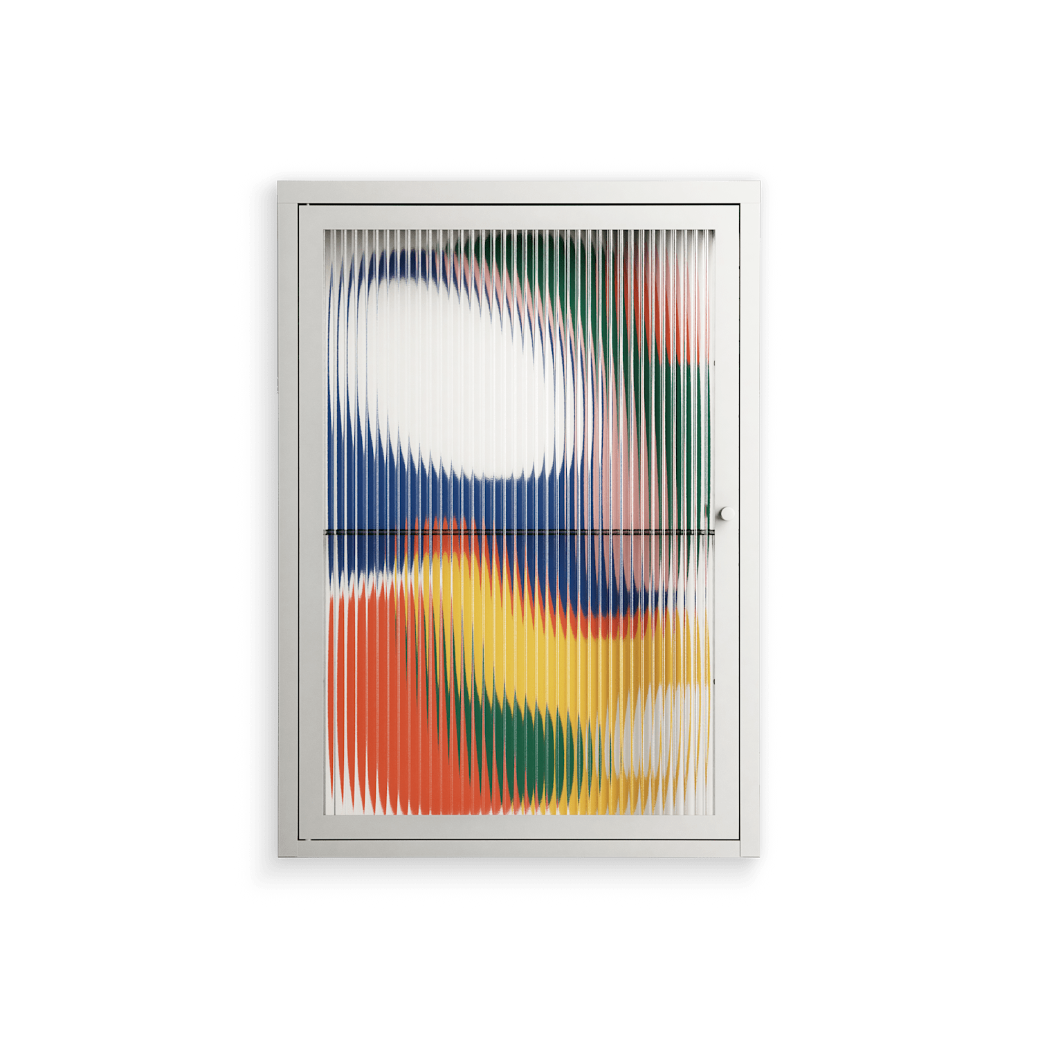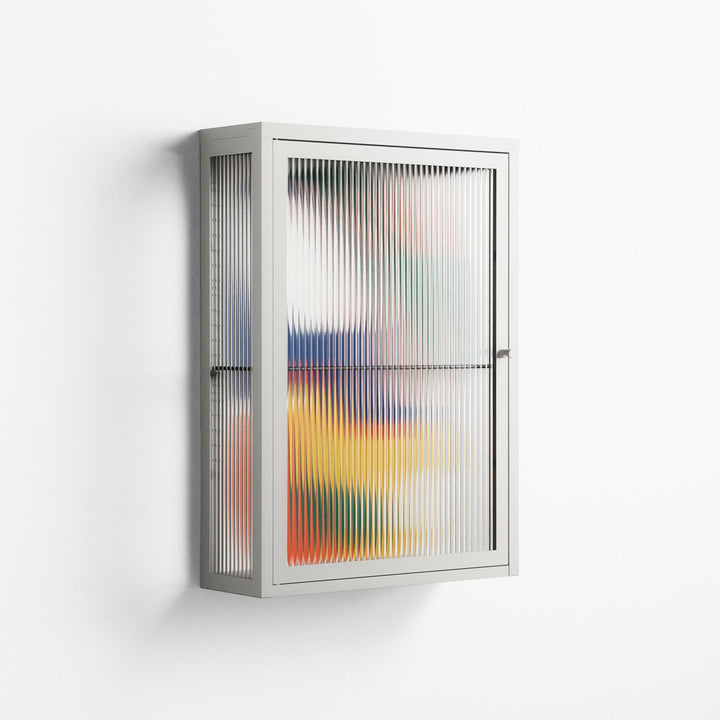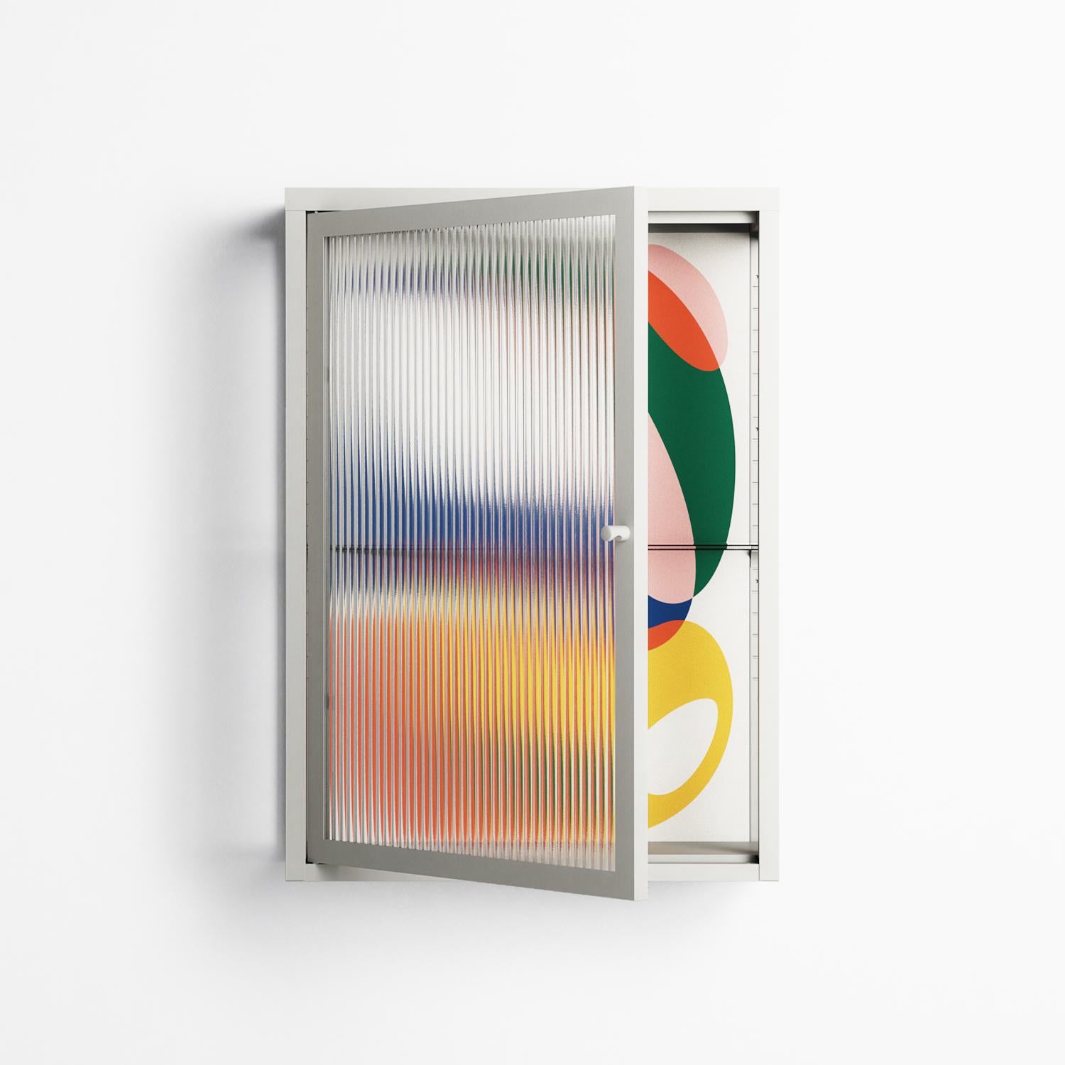 Spilled Paint by Vratislav Pecka, displayed within the Vitrine Wall Cabinet behind Reeded glass. Finished in the colour Chalk, the cabinet becomes a frame for the artwork and the objects within.