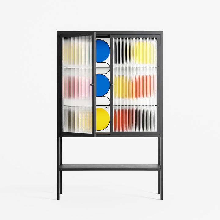 Springs by Vratislav Pecka, displayed within the Vitrine Loft Cabinet behind Reeded glass. Finished in the colour Antracite, the cabinet becomes a frame for the artwork and the objects within.
