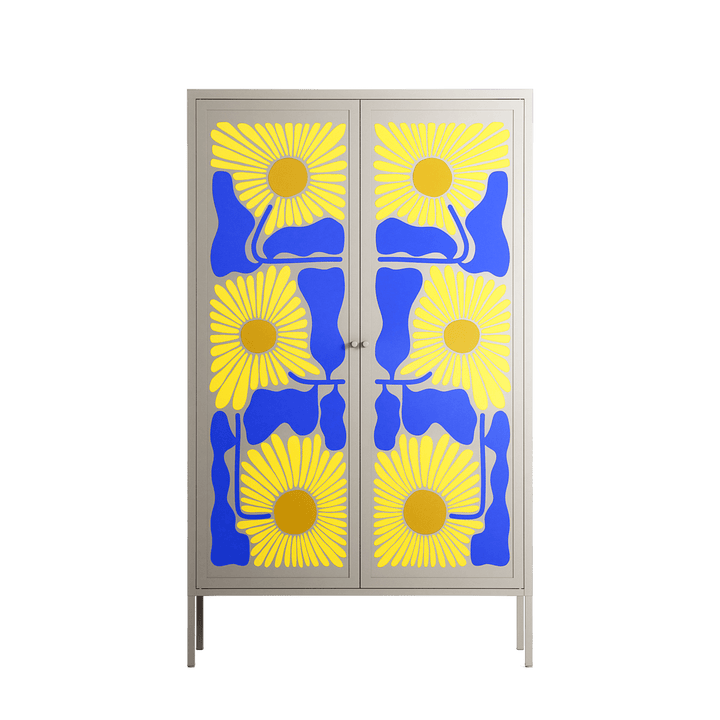 Sunflowers by Sandra Hutter, artistically portrayed on the Vitrine Cabinet. Finished in the colour Pebble, the cabinet blends artwork and object together.