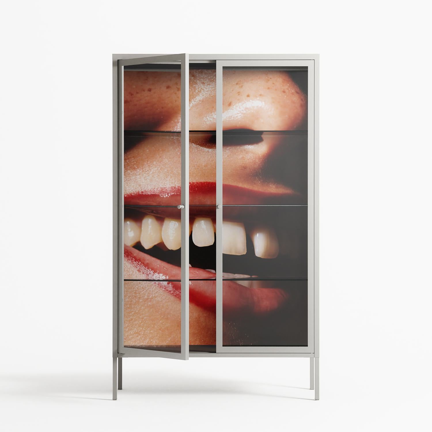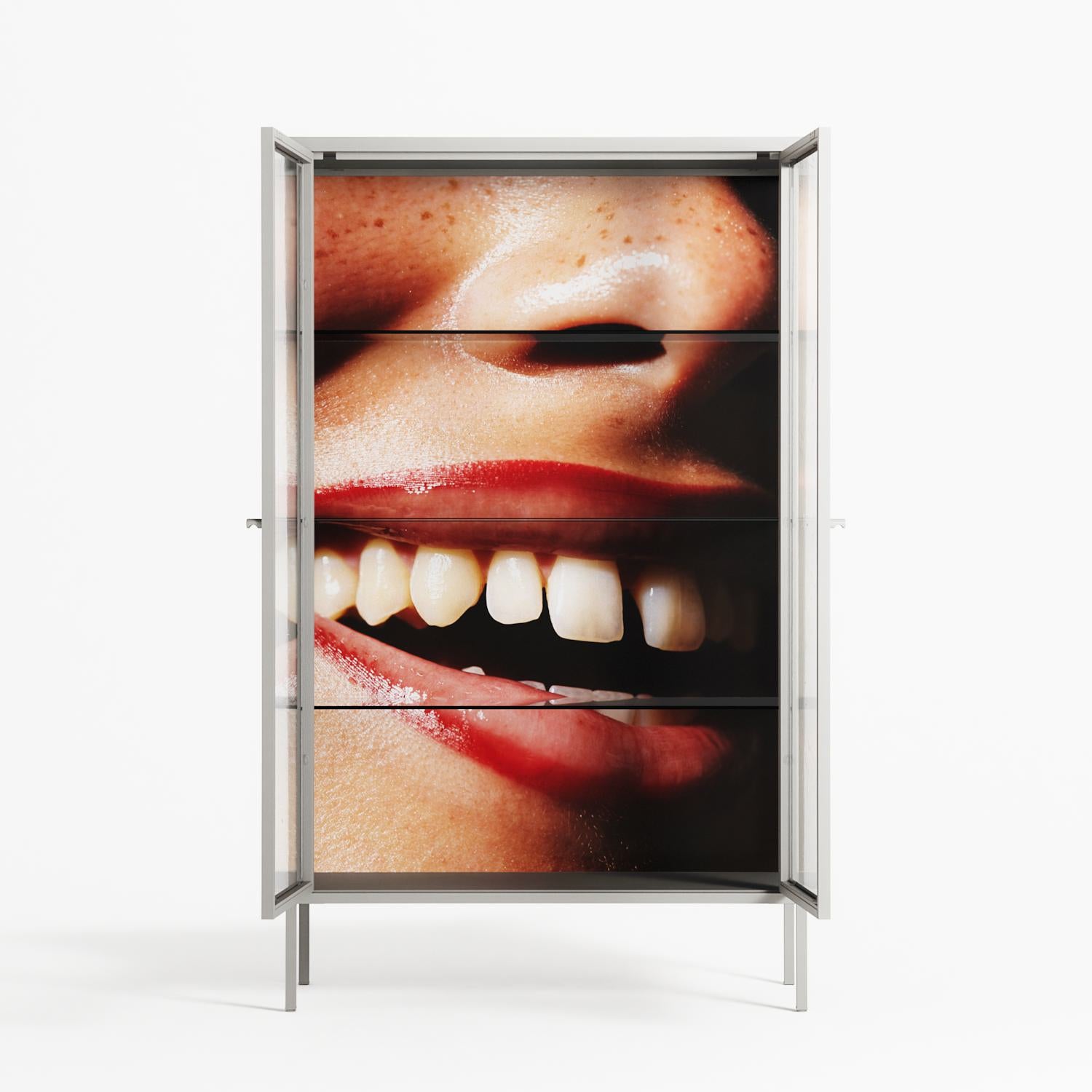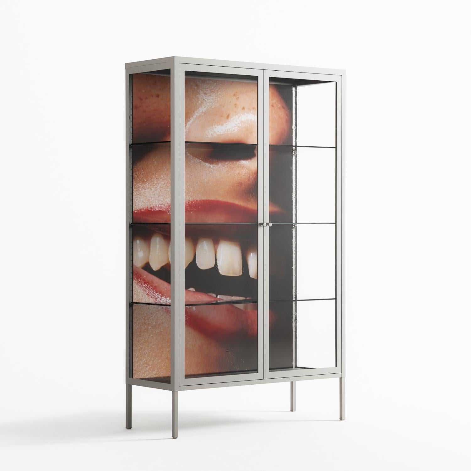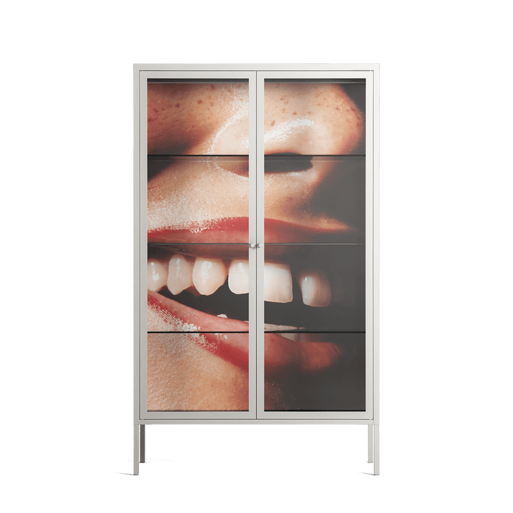 Teeth by Nadia Ryder, displayed within the Vitrine Cabinet behind Clear glass. Finished in the colour Chalk, the cabinet becomes a frame for the artwork and the objects within.