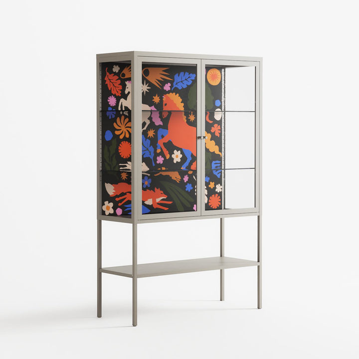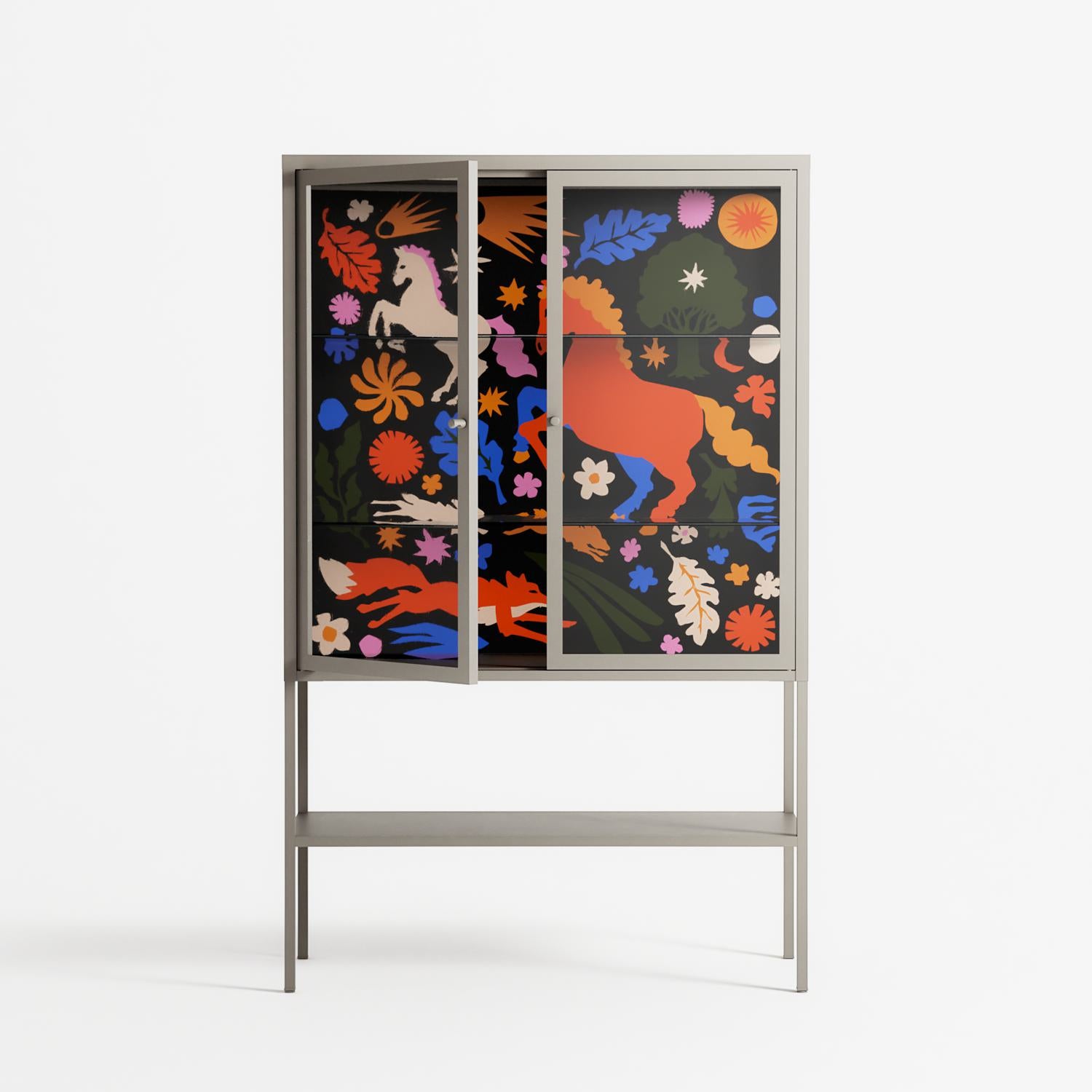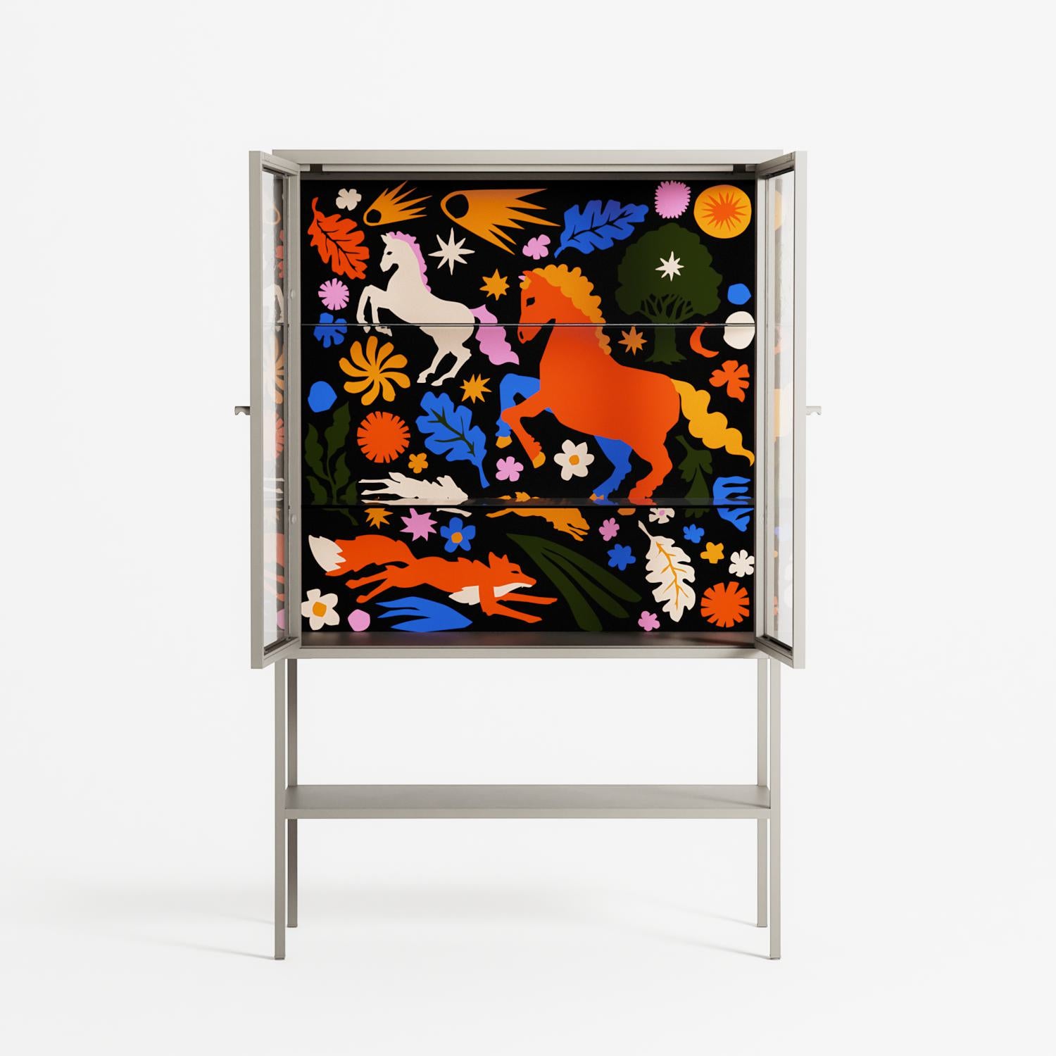 Vitrine pairs artworks by artists, designers, and creatives from around the world with a frame that elevates and displays them in everyday space. The cabinet is built from precision-cut metal with a powder-coated finish — resistant to wear and crafted for stability — making it ideal for both office and home spaces.