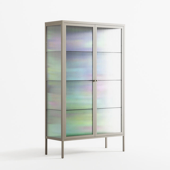 Transmutation by Cezar Berje, displayed within the Vitrine Cabinet behind Reeded glass. Finished in the colour Pebble, the cabinet becomes a frame for the artwork and the objects within.