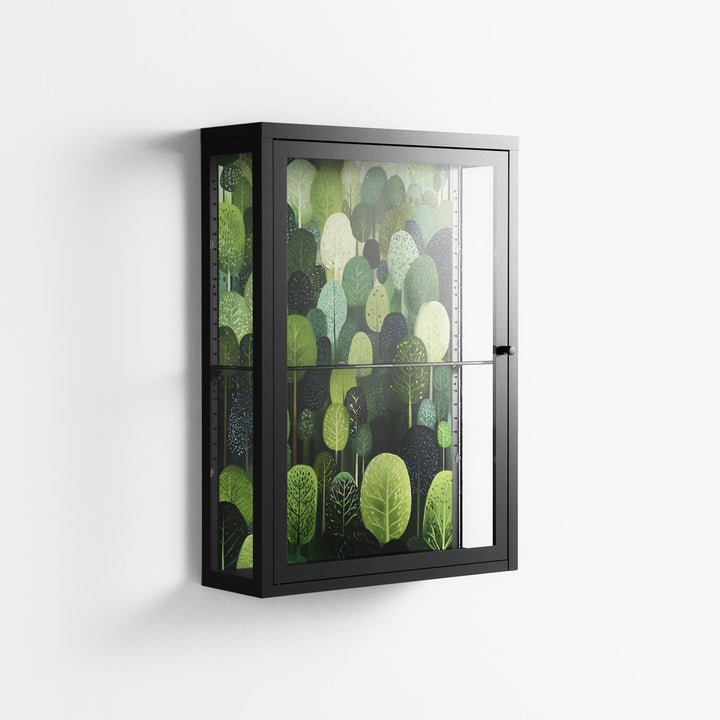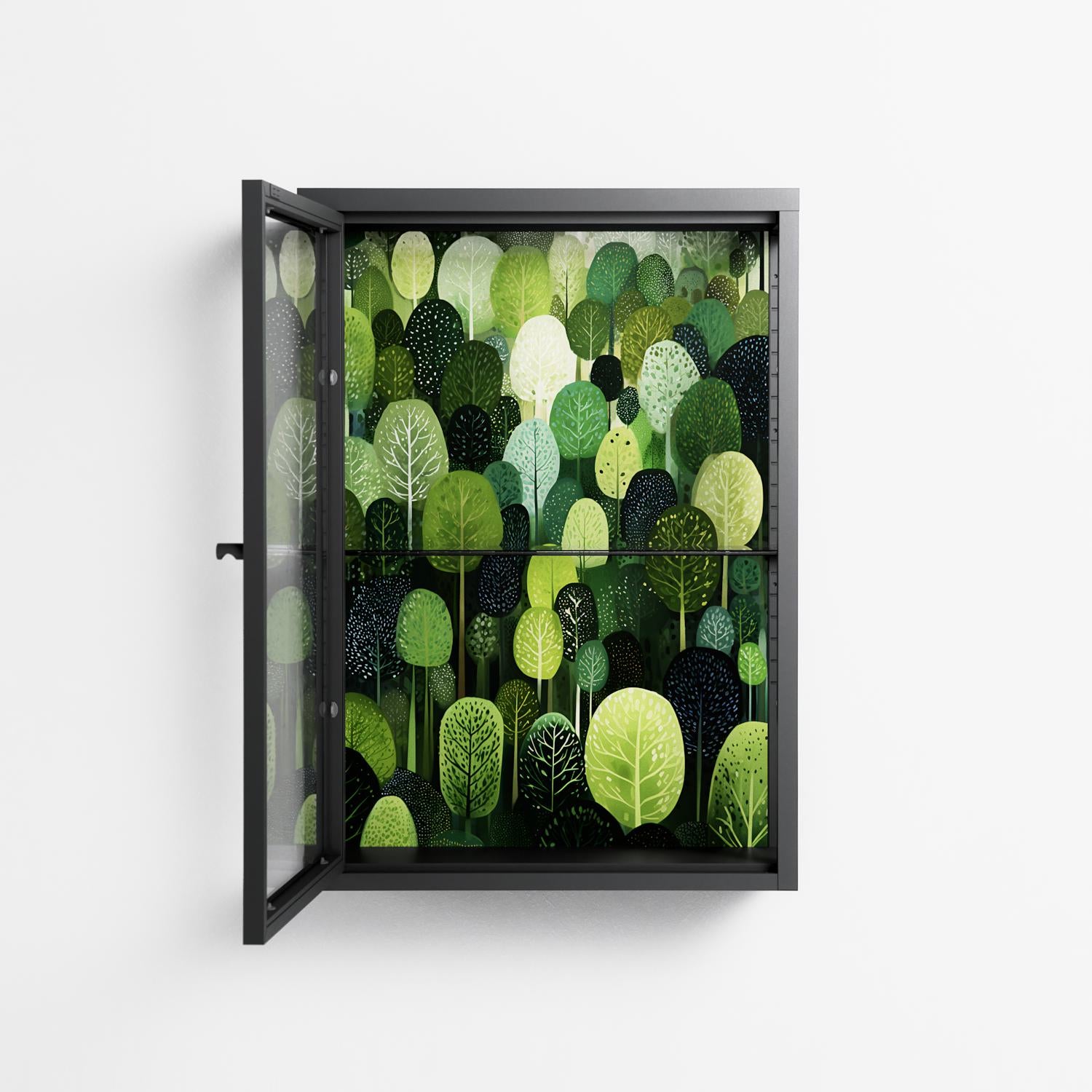 Tummetott by Nur Rydberg, displayed within the Vitrine Wall Cabinet behind Clear glass. Finished in the colour Antracite, the cabinet becomes a frame for the artwork and the objects within.