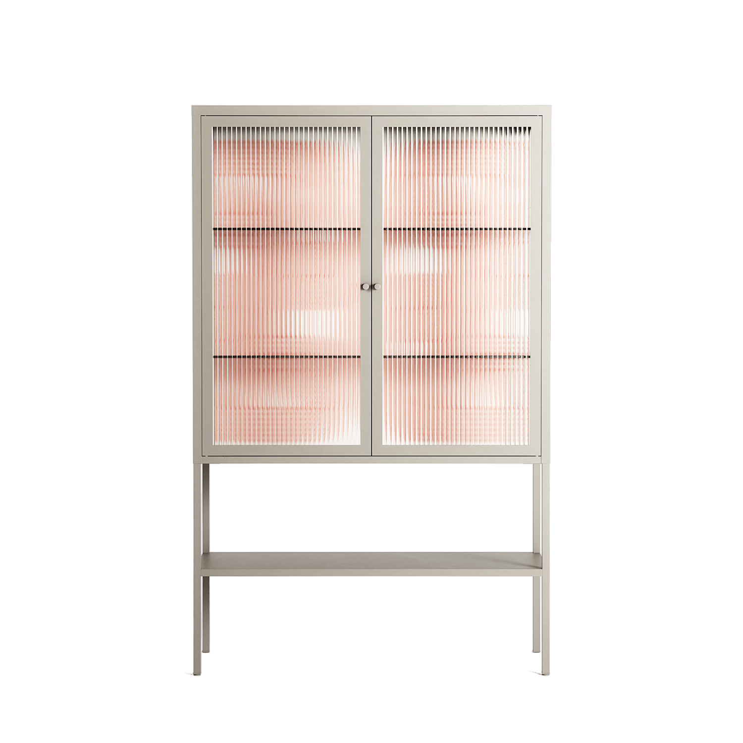 United by Vratislav Pecka, displayed within the Vitrine Loft Cabinet behind Reeded glass. Finished in the colour Pebble, the cabinet becomes a frame for the artwork and the objects within.