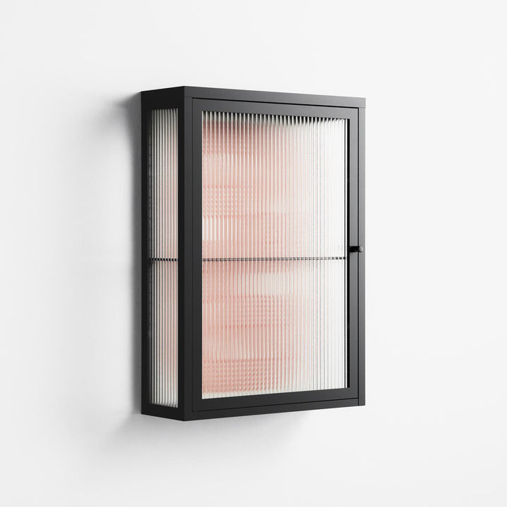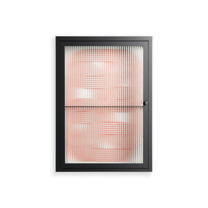 United by Vratislav Pecka, displayed within the Vitrine Wall Cabinet behind Reeded glass. Finished in the colour Antracite, the cabinet becomes a frame for the artwork and the objects within.
